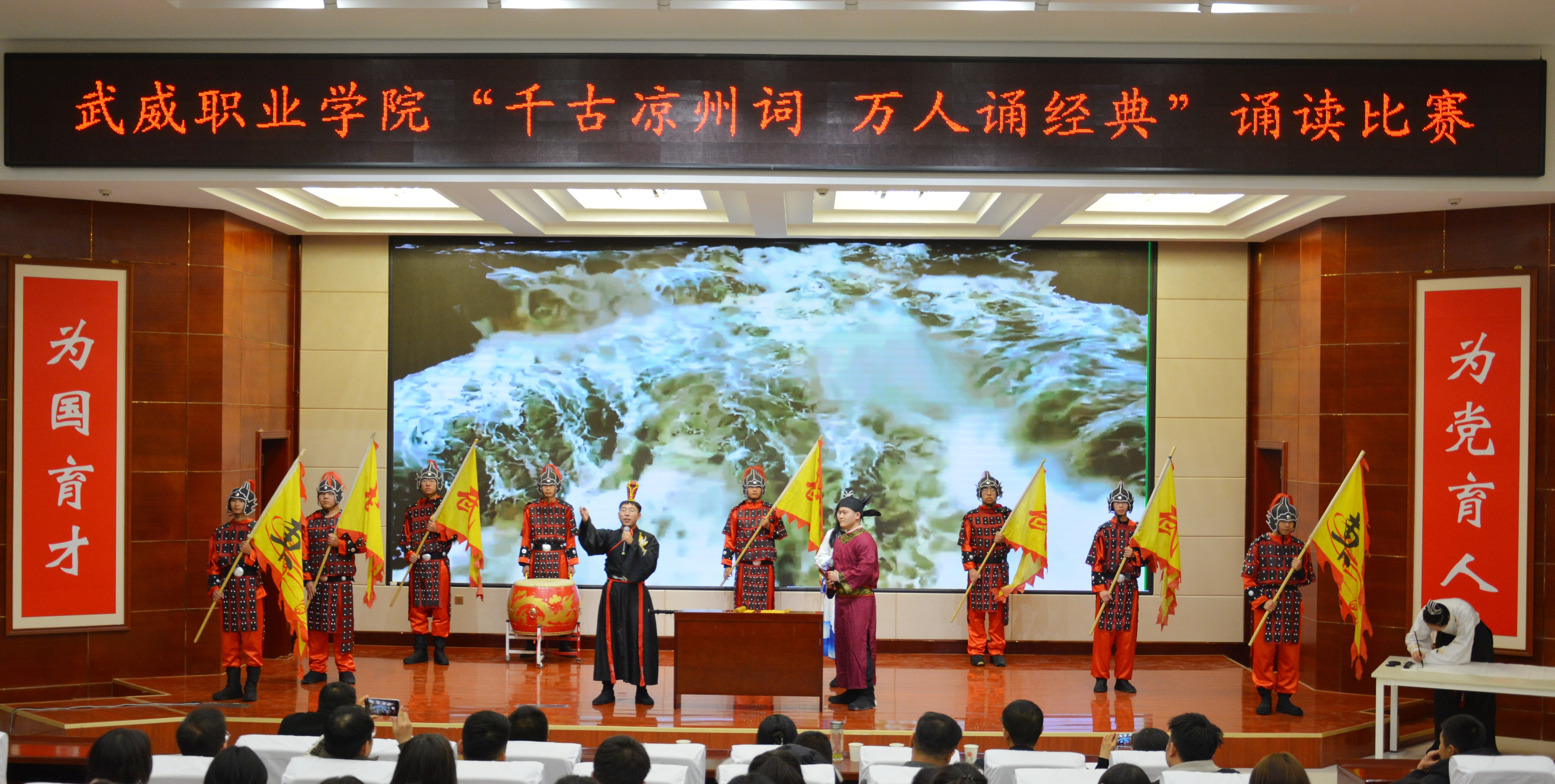 比賽現(xiàn)場(chǎng)精彩紛呈,現(xiàn)場(chǎng)氣氛異常熱烈,掌聲此起彼伏。節(jié)目以詩歌吟誦、伴舞、書法、國畫、武術(shù)、情景表演等豐富多彩的藝術(shù)形式,為現(xiàn)場(chǎng)觀眾打造出一場(chǎng)別開生面的涼州文化視聽盛宴。同學(xué)們激情洋溢,用澎湃真摯的情感演繹著經(jīng)典燦爛的磅礴詩篇,用跨越千年的對(duì)話勾勒出雄渾壯烈的漢武雄風(fēng),用鏗鏘有力的旋律編織出蕩氣回腸的時(shí)代頌歌,以青春奮斗的初心賡續(xù)著生生不息的五涼文化。