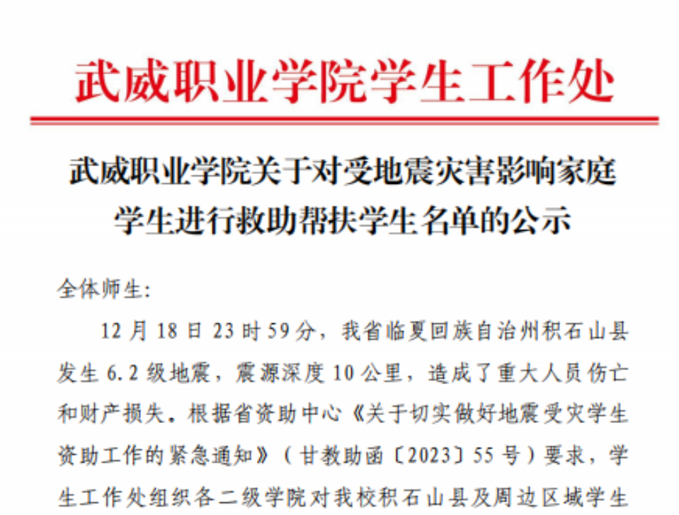 12月18日23時59分,我省臨夏回族自治州積石山縣發(fā)生6.2級地震。地震發(fā)生后,學(xué)校高度重視災(zāi)區(qū)學(xué)生家庭受災(zāi)情況,密切關(guān)注各項災(zāi)情的發(fā)展變化,第一時間對積石山縣及周邊區(qū)域地震受災(zāi)家庭學(xué)生情況進(jìn)行摸排,迅速啟動救助幫扶關(guān)愛工作。
