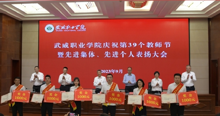 學校領導分別宣讀了《中共武威職業(yè)學院委員會關于表揚2023年教育工作先進集體和先進個人的決定》《武威職業(yè)學院關于認定(聘任)2023年“教書育人楷?!薄拔易钕矏鄣睦蠋煛薄敖虒W名師”“教學能手”“教學新秀”“骨干教師”“專業(yè)帶頭人”的決定》,向國獎獲獎團隊代表、優(yōu)秀教師代表頒發(fā)榮譽證書并發(fā)放慰問金。