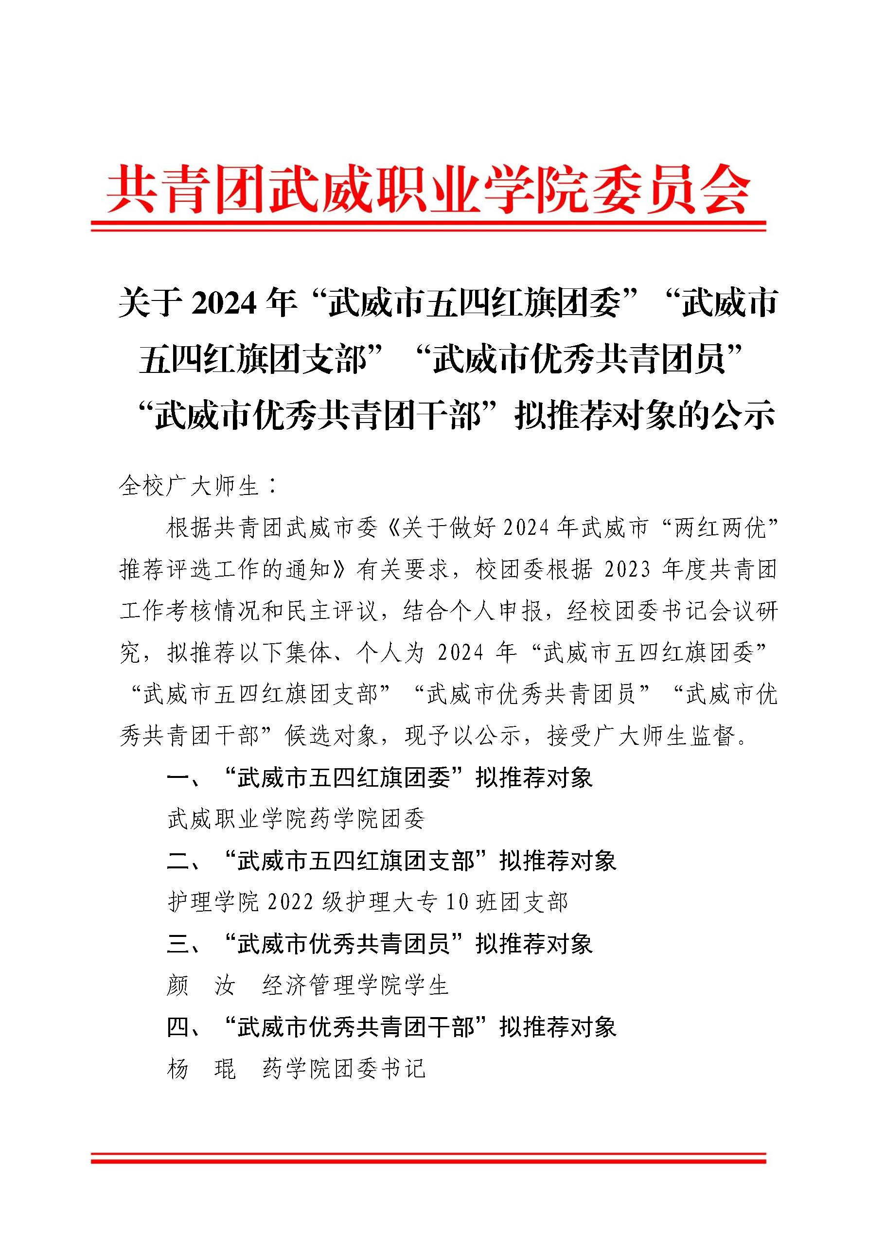 關(guān)于2024年“武威市五四紅旗團(tuán)委”“武威市五四紅旗團(tuán)支部”“武威市優(yōu)秀共青團(tuán)員”“武威市優(yōu)秀共青團(tuán)干部”擬推薦對象的公示