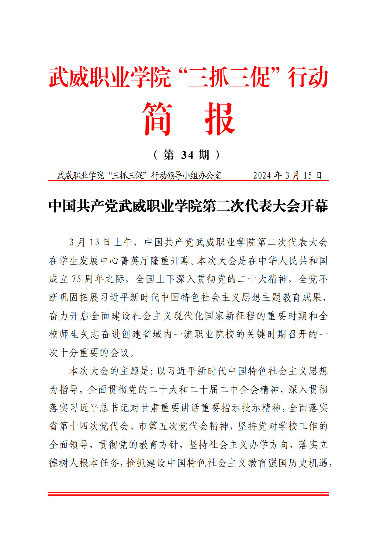 簡(jiǎn)報(bào)第34期:中國(guó)共產(chǎn)黨武威職業(yè)學(xué)院第二次代表大會(huì)開(kāi)幕