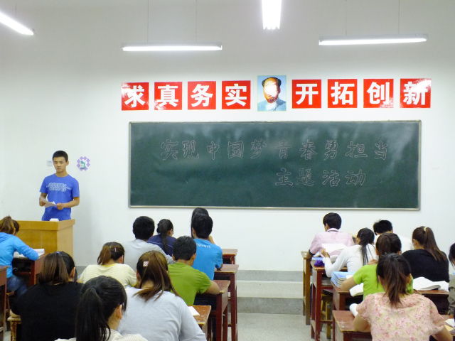 2013年5月20日,藥學(xué)系組織全體班團(tuán)干部在4號教學(xué)樓410教室開展了“實(shí)現(xiàn)中國夢,青春勇?lián)?dāng)”的主題班團(tuán)干部會活動,同學(xué)們認(rèn)真聆聽了習(xí)近平在同各界優(yōu)秀青年代表座談時(shí)的講話,習(xí)近平強(qiáng)調(diào),青年最富有朝氣,最富有夢想,青年興則國興,青年強(qiáng)則國強(qiáng)。