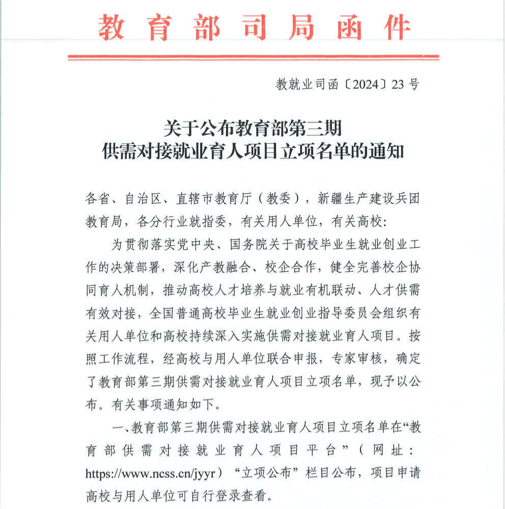 供需對接就業(yè)育人項目是教育部貫徹落實黨中央、國務(wù)院“穩(wěn)就業(yè)”“保就業(yè)”決策部署的舉措之一,旨在深化產(chǎn)教融合、校企合作,推動人才培養(yǎng)與就業(yè)有機聯(lián)動、人才供需有效對接的有效途徑。供需對接就業(yè)育人項目由高校和用人單位共同申報,經(jīng)教育部組織專家審核立項。用人單位提供項目專項經(jīng)費和資源支持,通過與高校開展定向人才培養(yǎng)、就業(yè)實習等合作,培養(yǎng)更多高素質(zhì)技術(shù)技能型人才。
