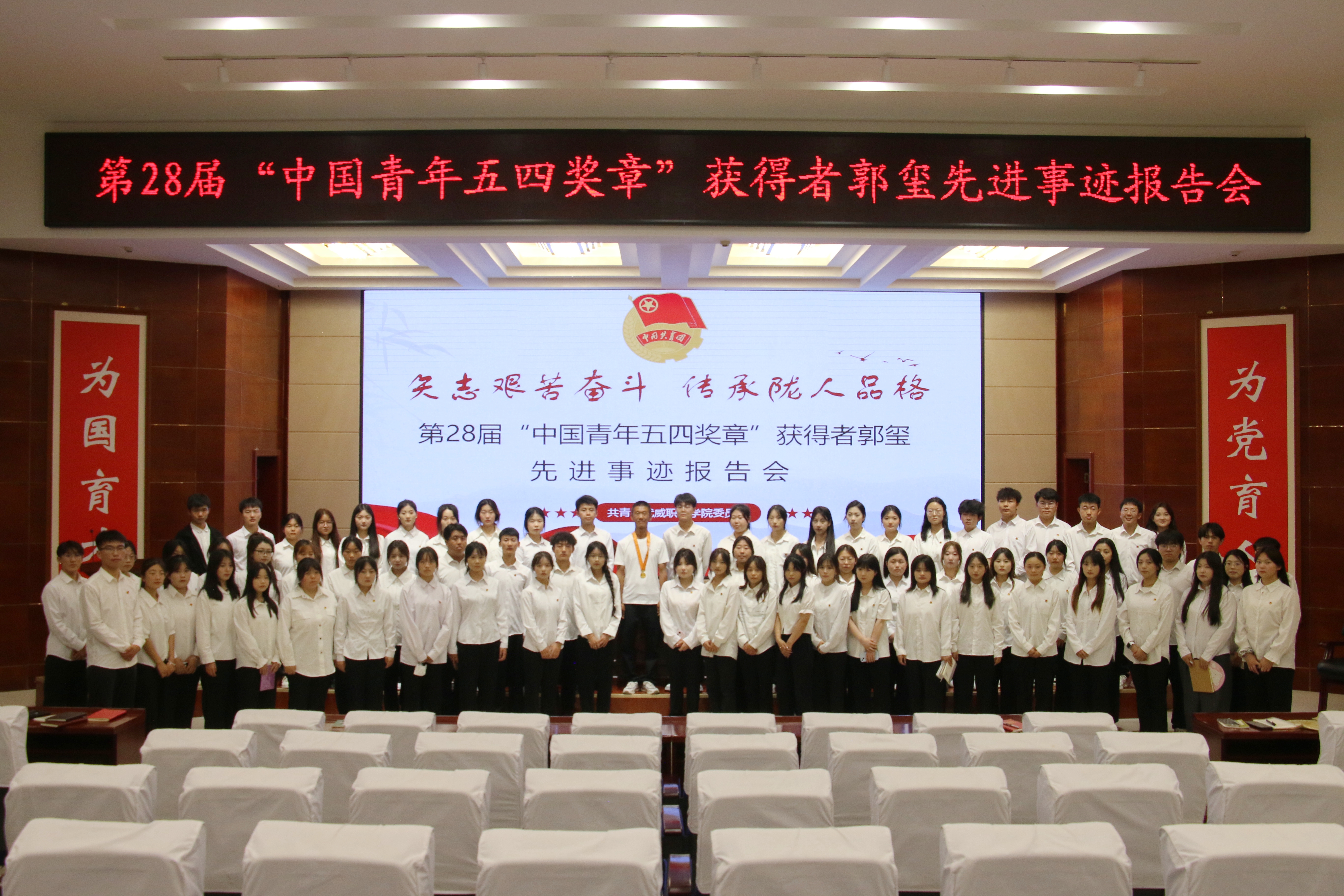 為進(jìn)一步引導(dǎo)和激勵(lì)團(tuán)員青年踔厲奮發(fā)、篤行不怠,厚植奮斗底色,5月24日,學(xué)校在菁英廳舉行“矢志艱苦奮斗傳承隴人品格”第28屆“中國青年五四獎(jiǎng)?wù)隆眰€(gè)人先進(jìn)事跡報(bào)告會(huì)。學(xué)校邀請(qǐng)第28屆“中國青年五四獎(jiǎng)?wù)隆鲍@得者——郭璽同志出席活動(dòng),并作了“三代青春鑄綠洲”主題宣講報(bào)告。學(xué)?!扒囫R工程”培訓(xùn)班學(xué)員、優(yōu)秀學(xué)生代表共計(jì)220余人參加報(bào)告會(huì)。會(huì)議由團(tuán)委副書記謝麗霞主持。