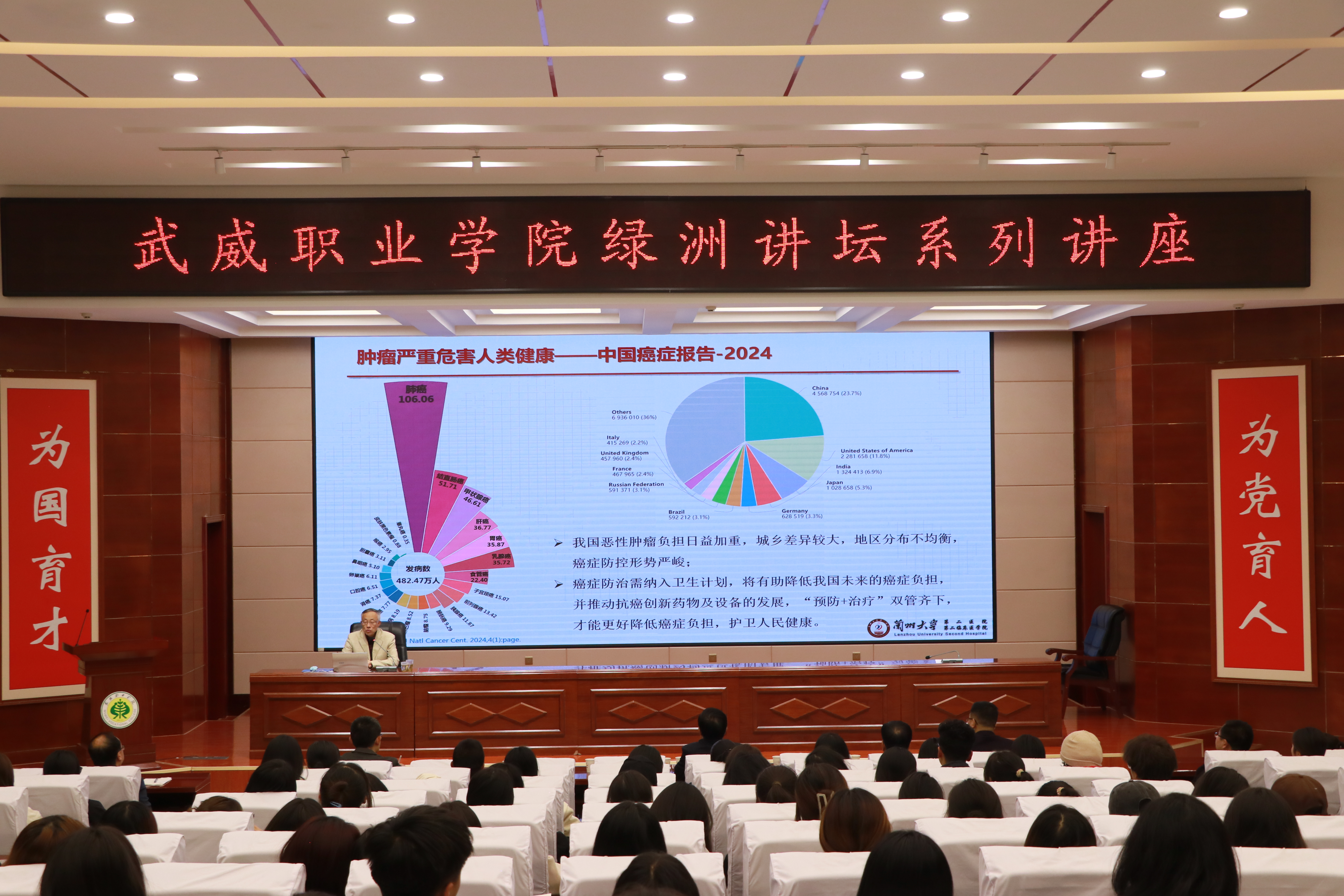 報(bào)告會(huì)由學(xué)校校長(zhǎng)、黨委副書(shū)記張開(kāi)禮主持,特邀蘭州大學(xué)第二醫(yī)院王志平教授作了“腫瘤臨床放射治療的過(guò)去、現(xiàn)在和未來(lái)與人才”的主題講座,甘肅省武威醫(yī)學(xué)科學(xué)院腫瘤醫(yī)院醫(yī)護(hù)人員代表、蘭州大學(xué)實(shí)習(xí)生代表和學(xué)校師生代表共計(jì)220余人參加了報(bào)告會(huì)。