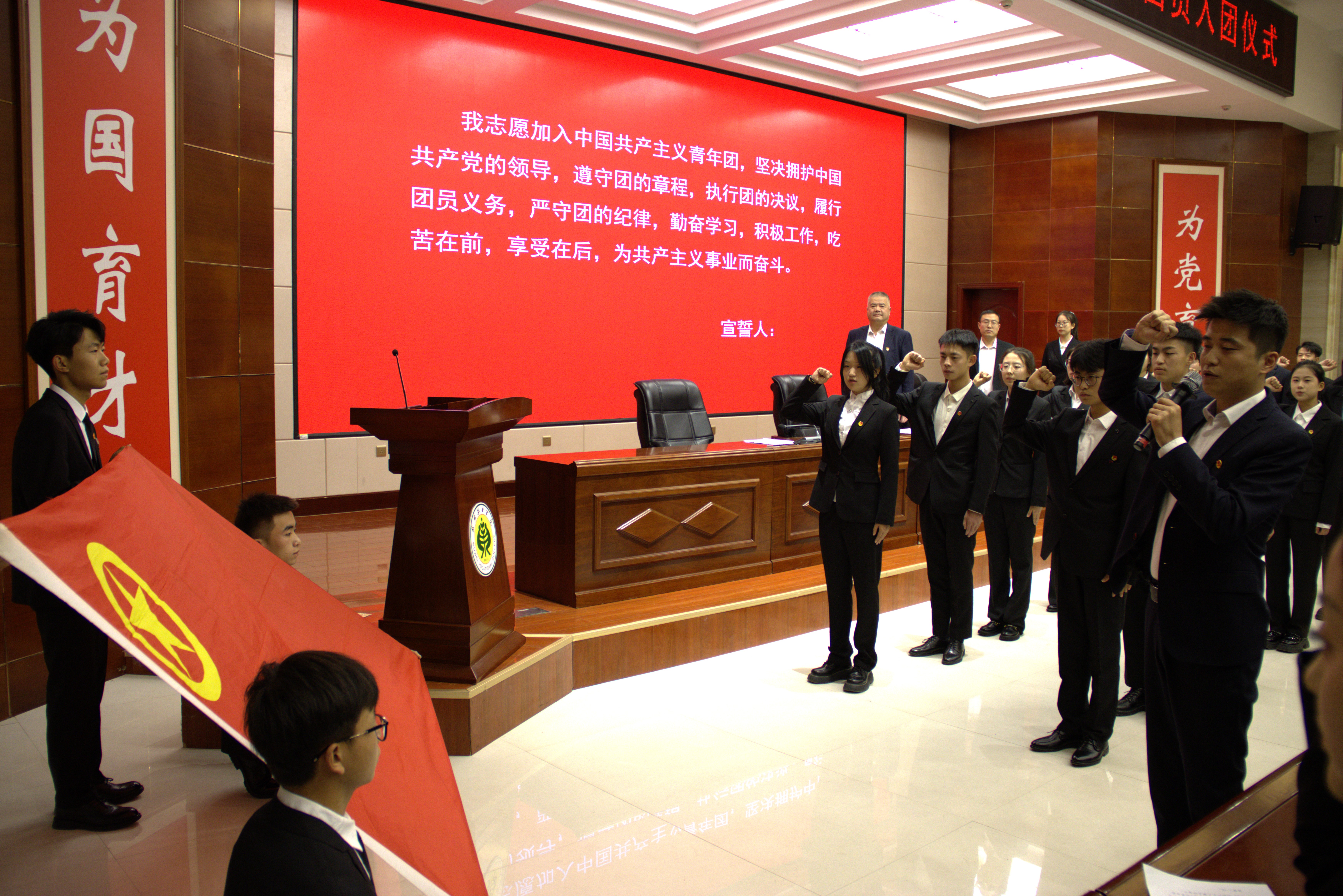 入團(tuán)儀式上,宣讀了422名新團(tuán)員名單,老團(tuán)員為新團(tuán)員代表佩戴團(tuán)徽,全體新老團(tuán)員面向團(tuán)旗莊嚴(yán)宣誓。