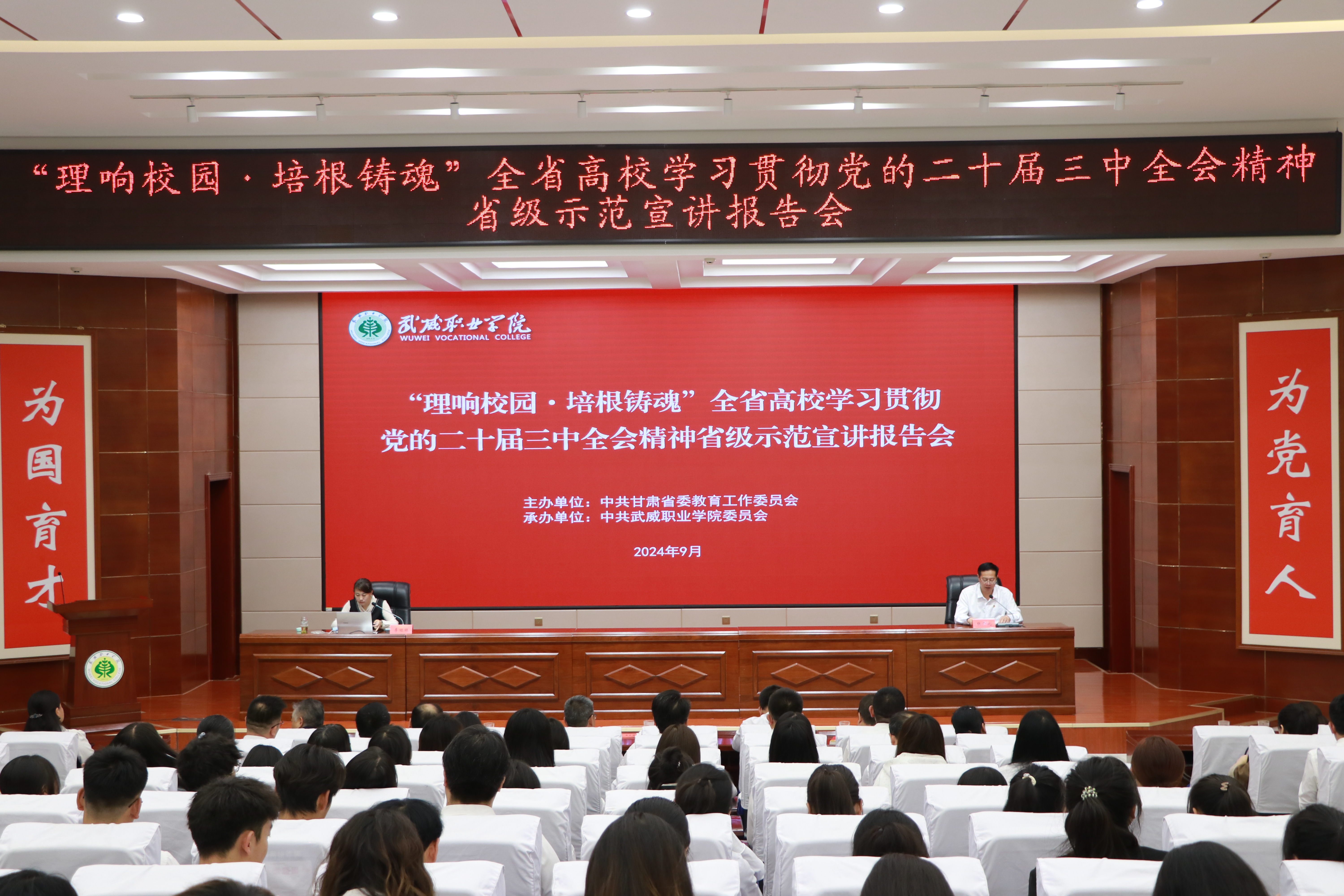 為全面深入學(xué)習(xí)宣傳貫徹黨的二十屆三中全會精神,堅持不懈用黨的創(chuàng)新理論鑄魂育人,按照省委教育工委相關(guān)安排,9月8日下午,學(xué)校在菁英廳舉辦“理響校園·培根鑄魂”全省高校學(xué)習(xí)貫徹黨的二十屆三中全會精神省級示范宣講報告會。省委教育工委宣講團(tuán)成員、河西學(xué)院馬克思主義學(xué)院李婭婭副教授應(yīng)邀為我校師生作宣講報告。學(xué)校黨委班子成員、各部門、二級學(xué)院黨政負(fù)責(zé)人,教師代表,學(xué)生代表,共計220余人參加報告會。黨委副書記、校長張開禮主持報告會。