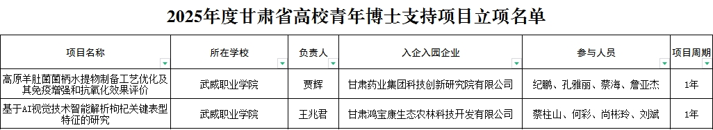 近日,甘肅省教育廳公布了2025年度甘肅省高校青年博士支持項目評審結(jié)果公示,我校賈輝博士主持的《高原羊肚菌菌柄水提物制備工藝優(yōu)化及其免疫增強和抗氧化效果評價》和王兆君博士主持的《基于AI視覺技術智能解析枸杞關鍵表型特征的研究》2個研究項目成功獲批。