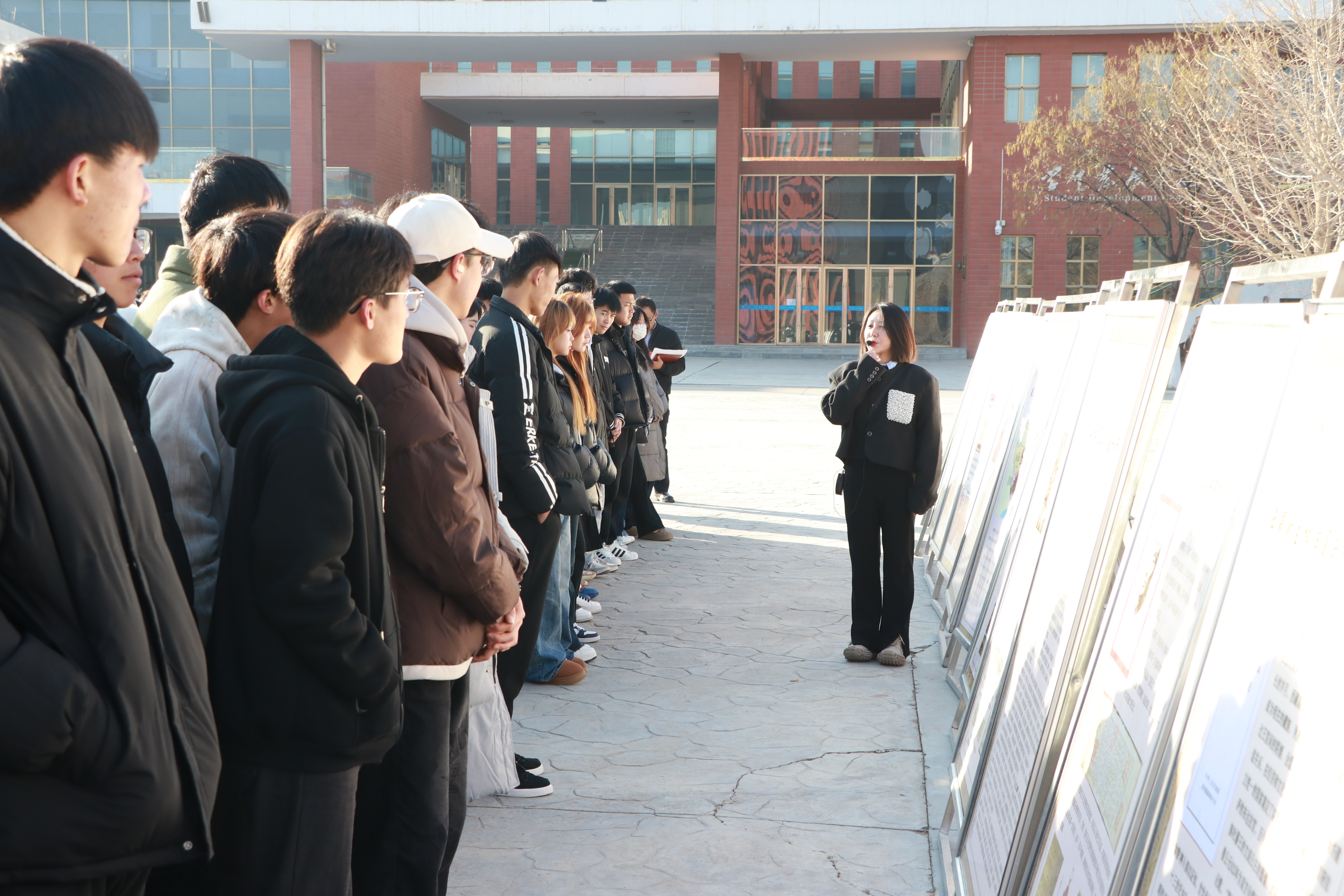 在學(xué)生發(fā)展中心前廣場(chǎng),同學(xué)們現(xiàn)場(chǎng)參觀了民族文化宣傳展板,二十余塊展板圖文并茂生動(dòng)展現(xiàn)了涼州會(huì)盟的歷史背景和意義,展示了新時(shí)代武威市在民族團(tuán)結(jié)進(jìn)步方面的壯闊歷程和取得的豐碩成果。武威市涼州會(huì)盟紀(jì)念館講解員楊琪以涼州會(huì)盟歷史為線,現(xiàn)場(chǎng)向大家講解了民族團(tuán)結(jié)故事。