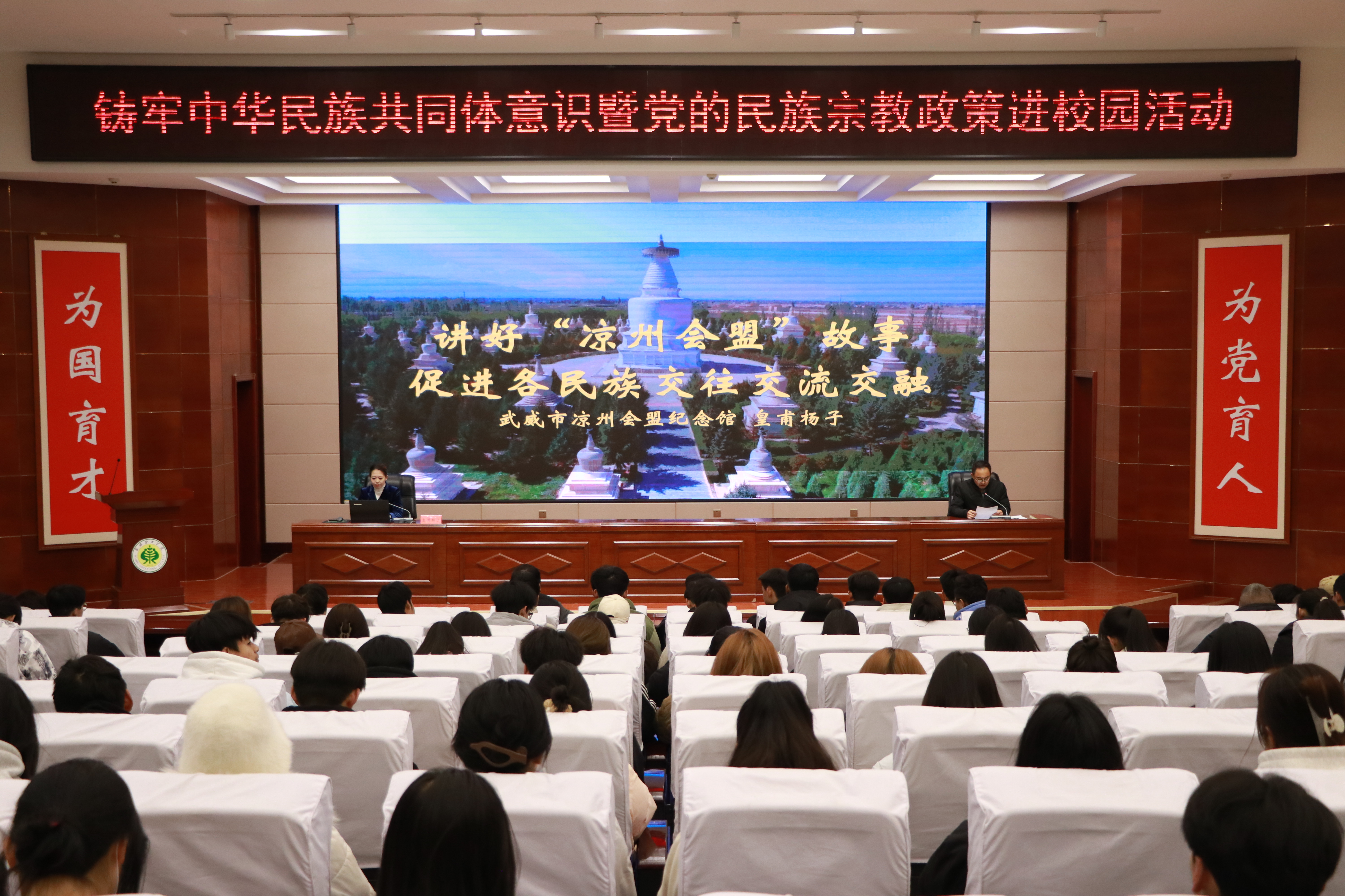 參觀活動(dòng)后,武威市鑄牢中華民族共同體意識(shí)“紅石榴”宣講員皇甫楊子在學(xué)校菁英廳以《講好涼州會(huì)盟故事 促進(jìn)各民族交流交融》為題開(kāi)展了主題講座。她通過(guò)生動(dòng)的案例和富有感染力的語(yǔ)言,深入剖析涼州會(huì)盟的歷史背景、文化意義以及對(duì)當(dāng)代民族團(tuán)結(jié)的啟示,引導(dǎo)同學(xué)們深刻感知中華民族多元一體格局的優(yōu)越性,增強(qiáng)對(duì)中華民族大家庭的認(rèn)同感和歸屬感。
