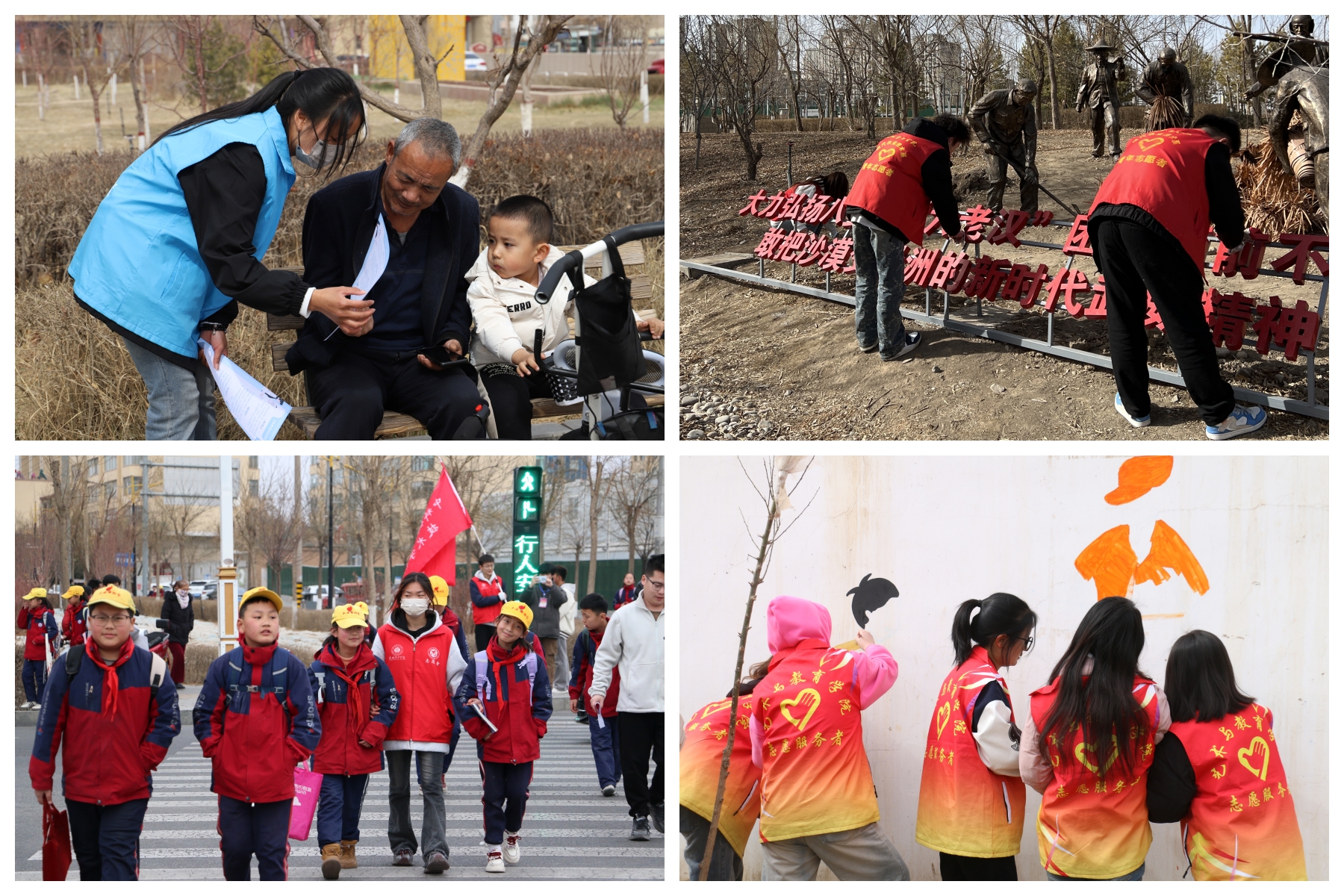 開展青春社區(qū)志愿服務(wù)活動(dòng)。3月4日,護(hù)理學(xué)院組織15名志愿者前往西關(guān)街社區(qū)開展“保護(hù)環(huán)境,建設(shè)美麗社區(qū)”志愿服務(wù)活動(dòng),活動(dòng)中志愿者們手持清潔工具,鏟除墻面小廣告,倡導(dǎo)綠色環(huán)保生活理念,引導(dǎo)市民共同守護(hù)美好家園。3月9日,現(xiàn)代農(nóng)業(yè)學(xué)院組織志愿者前往海藏公園開展“公園環(huán)保行動(dòng)派”志愿服務(wù)活動(dòng),清理雜草雜物,向過往群眾宣傳垃圾分類知識(shí)。3月6日,中科低碳新能源技術(shù)學(xué)院志愿者在學(xué)校周邊十字路口開展文明交通勸導(dǎo)活動(dòng),向行人普及交通安全知識(shí)、提醒遵守交通信號(hào)燈,向騎行者強(qiáng)調(diào)佩戴安全頭盔、不逆行、不闖紅燈的重要性,組成護(hù)學(xué)小分隊(duì)引導(dǎo)周邊小學(xué)的同學(xué)有序通過馬路等。3月29日,藝術(shù)與教育學(xué)院學(xué)前教育專業(yè)20余名志愿者前往富鑫源社區(qū)化身“社區(qū)美育師”,與甘肅十二元素傳媒有限公司設(shè)計(jì)師共同完成了“鄰里和諧”主題墻繪。
