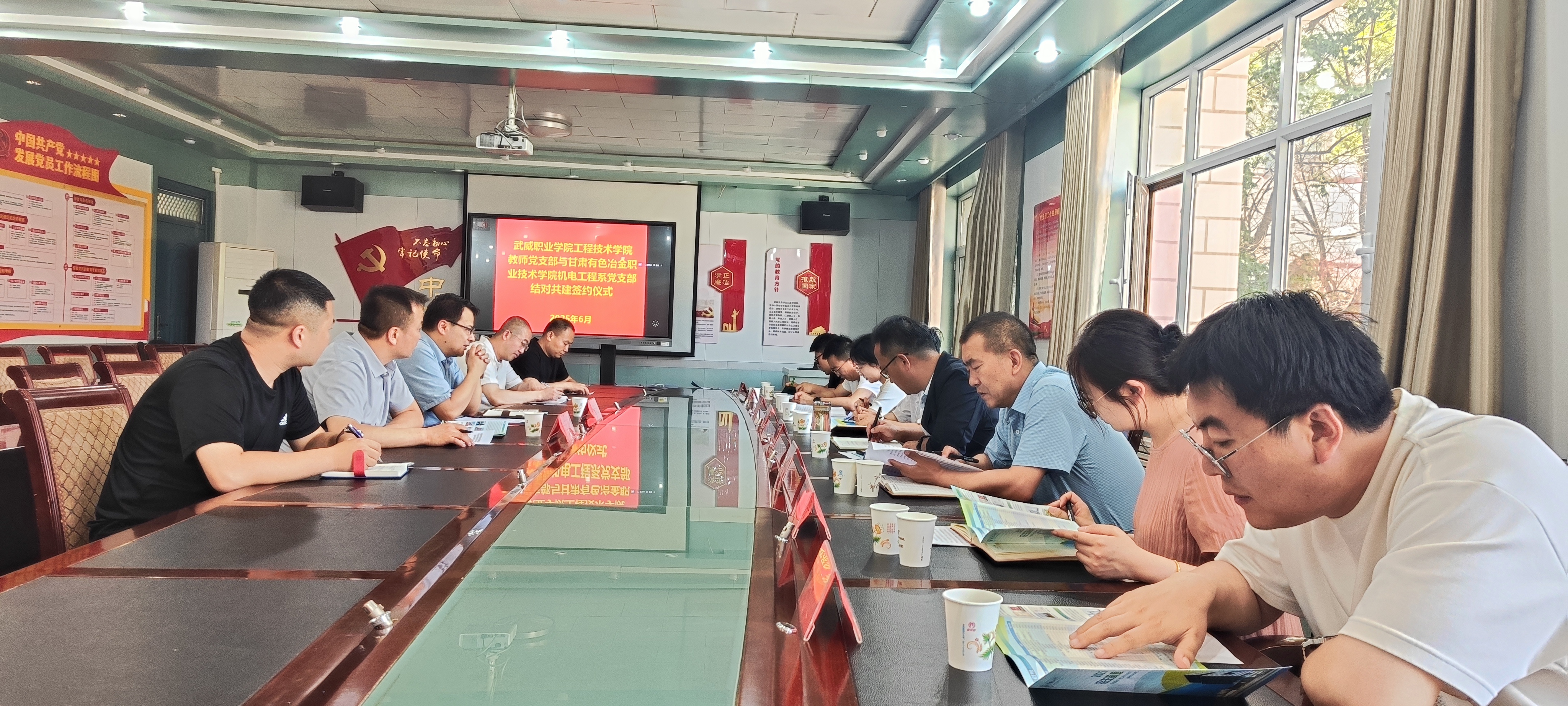 為進(jìn)一步加強(qiáng)黨組織建設(shè),提升黨員的政治素養(yǎng)和黨性修養(yǎng),6月11日,學(xué)校工程技術(shù)學(xué)院教師黨支部和甘肅有色冶金職業(yè)技術(shù)學(xué)院機(jī)電工程系黨支部結(jié)對(duì)共建簽約儀式在博學(xué)樓黨員活動(dòng)室舉行。甘肅有色冶金職業(yè)技術(shù)學(xué)院組織部部長(zhǎng)高立兵、督導(dǎo)中心主任趙登峰、機(jī)電工程系黨支部書(shū)記侯婷婷,學(xué)校工程技術(shù)學(xué)院黨總支書(shū)記王鐸云、副院長(zhǎng)徐生龍出席儀式,雙方黨員共計(jì)20人參加儀式。