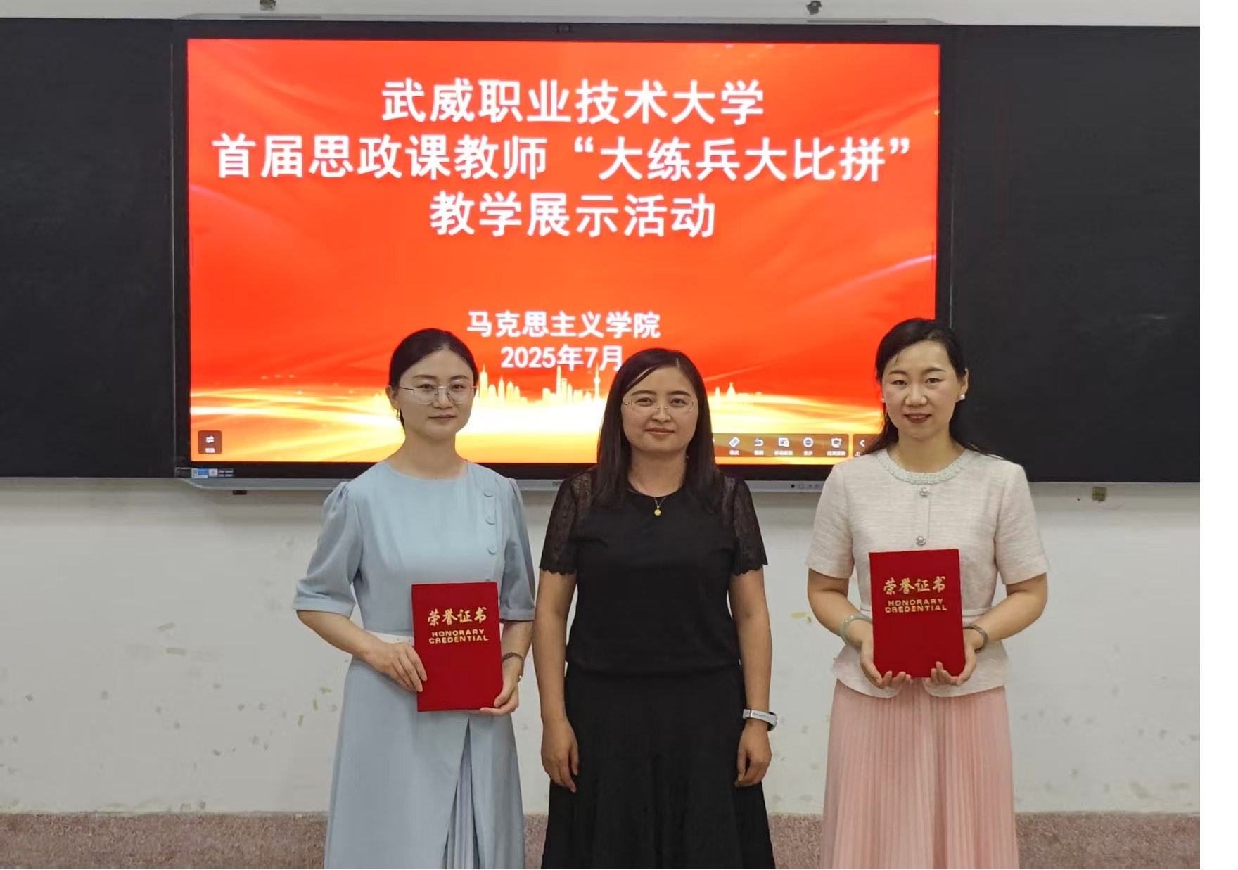 7月3日,武威職業(yè)技術(shù)大學(xué)首屆思政課教師“大練兵大比拼”教學(xué)展示活動(dòng)在勵(lì)勤樓206教室成功舉辦?;顒?dòng)旨在推動(dòng)新時(shí)代思想政治理論課高質(zhì)量發(fā)展,提升思政課教師教學(xué)水平,打造高素質(zhì)思政課教師隊(duì)伍。