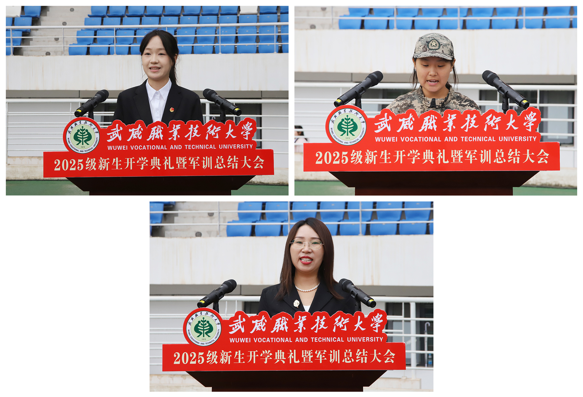 新生代表信息技術(shù)學(xué)院2025級(jí)物聯(lián)網(wǎng)本科專業(yè)學(xué)生胥媛,教師代表2025年武威市優(yōu)秀教師、護(hù)理學(xué)院王艷麗,在校生代表藝術(shù)與教育學(xué)院2023級(jí)學(xué)前教育專業(yè)潘怡彤先后發(fā)言,分享了她們各自在工作、學(xué)習(xí)中的心得,勉勵(lì)大家要樹立遠(yuǎn)大理想、始終追求卓越、保持軍訓(xùn)底色、珍惜求學(xué)時(shí)光,不負(fù)青春、不負(fù)時(shí)代。
