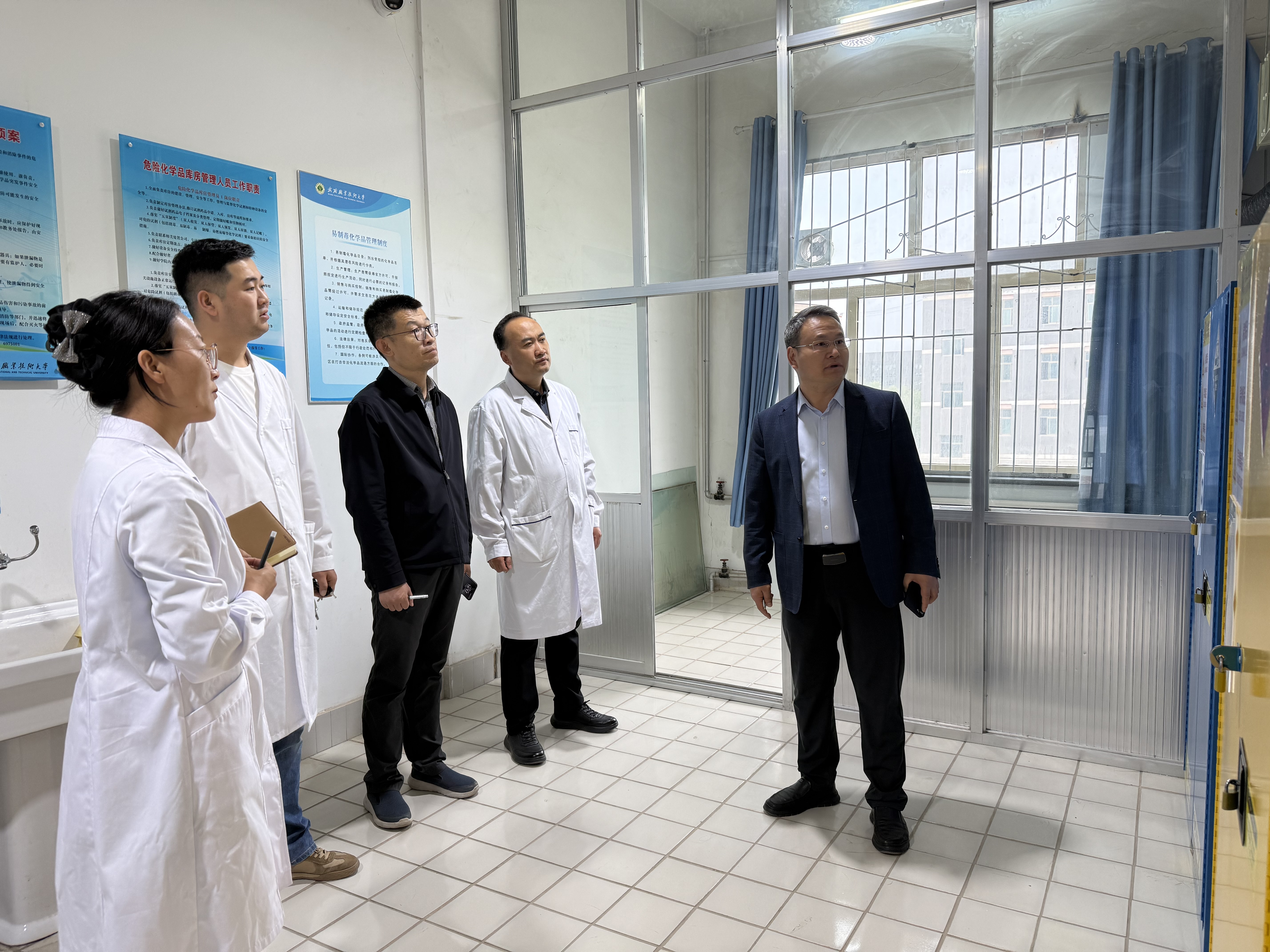 伍國強先后檢查了中科低碳新能源技術(shù)學(xué)院、農(nóng)業(yè)與食品工程學(xué)院、醫(yī)學(xué)技術(shù)學(xué)院、護理學(xué)院、藥學(xué)院、智能制造學(xué)院的實驗實訓(xùn)室,通過實地查看、詢問交流、查閱記錄等方式,重點圍繞場所環(huán)境警示標識、消防設(shè)施、應(yīng)急噴淋與洗眼裝置、監(jiān)控設(shè)施、危險化學(xué)品、特種設(shè)備等進行了全面細致的檢查,對于發(fā)現(xiàn)的問題隱患當場提出整改意見,要求做到即知即改,不留死角。