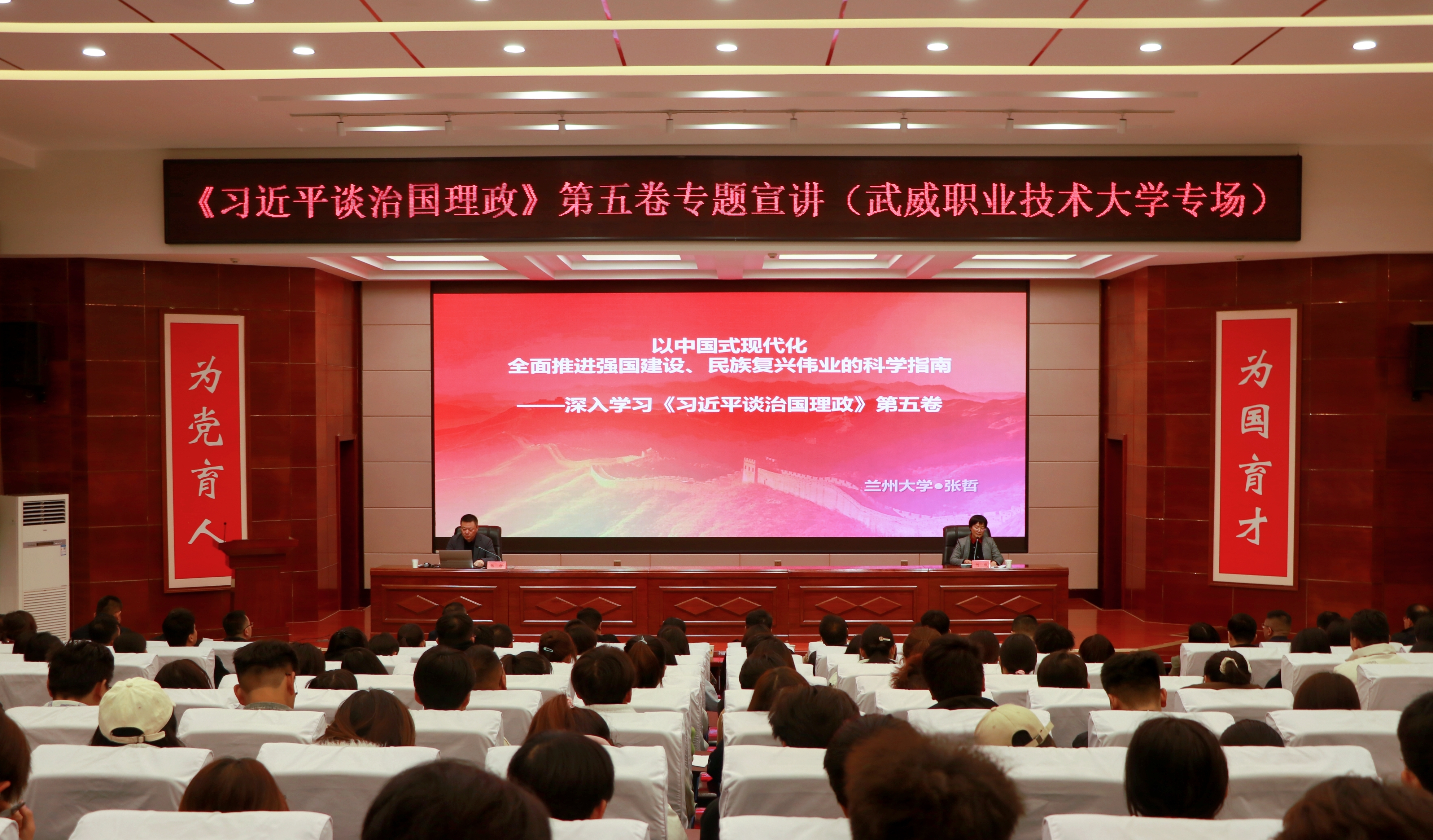 10月23日,《習(xí)近平談治國(guó)理政》第五卷專(zhuān)題宣講活動(dòng)在武威職業(yè)技術(shù)大學(xué)學(xué)生發(fā)展中心菁英廳成功舉辦,省委講師團(tuán)成員、蘭州大學(xué)馬克思主義學(xué)院張哲教授作專(zhuān)題宣講報(bào)告。黨委委員、副校長(zhǎng)何毅主持報(bào)告會(huì)。