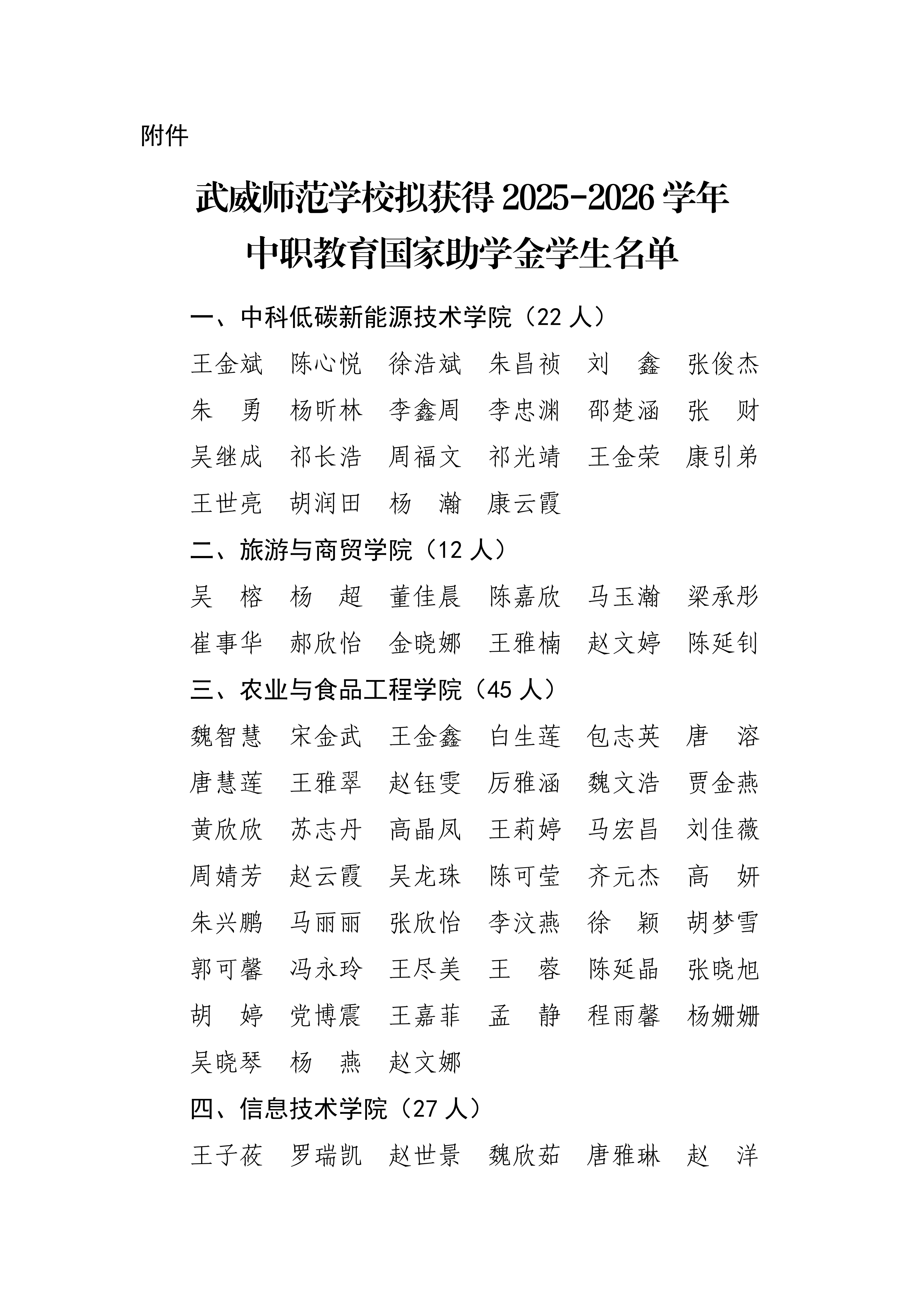 甘肅省武威師范學校關于2025-2026學年國家助學金評選結果的公示