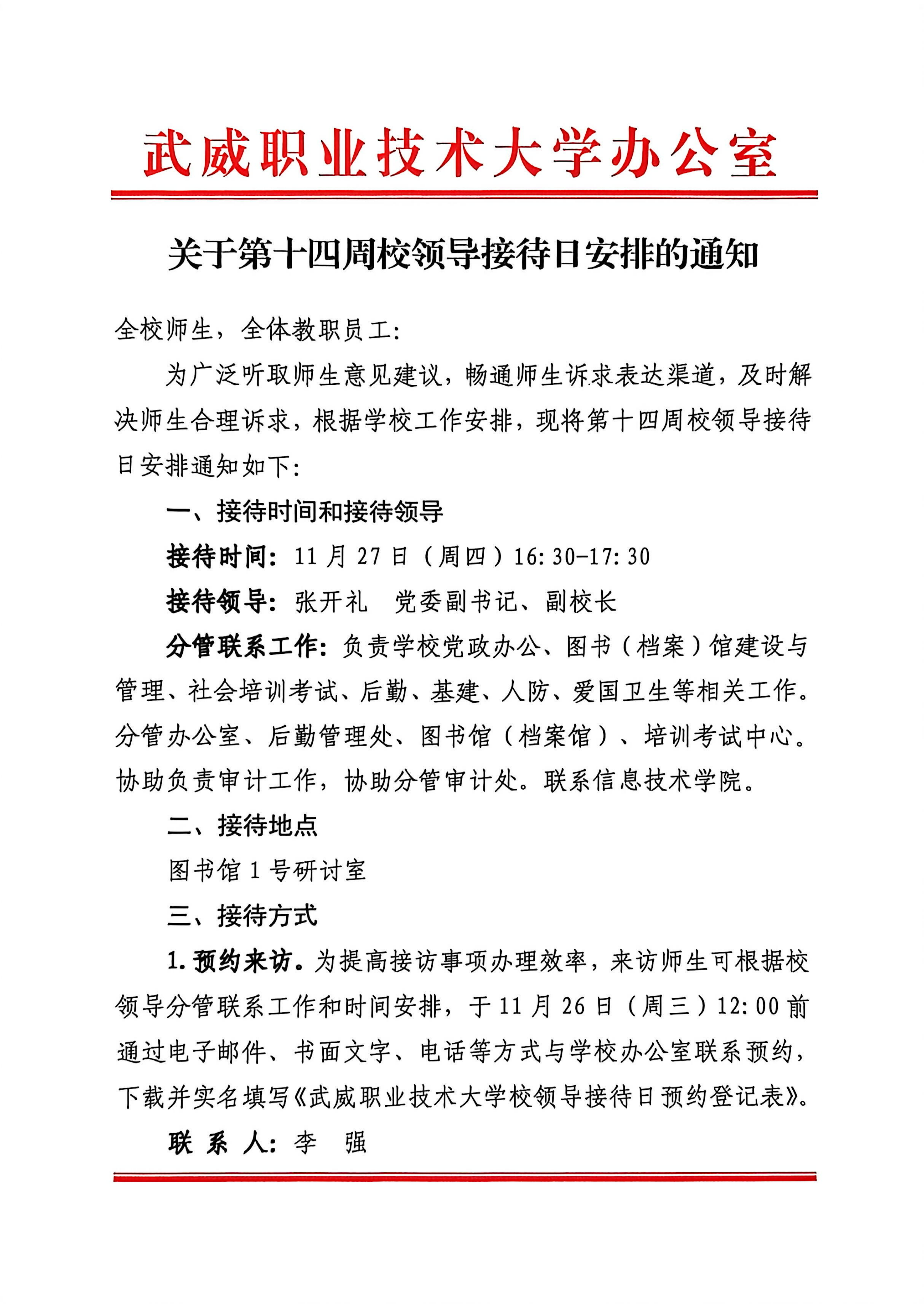 關(guān)于第十四周校領(lǐng)導(dǎo)接待日安排的通知