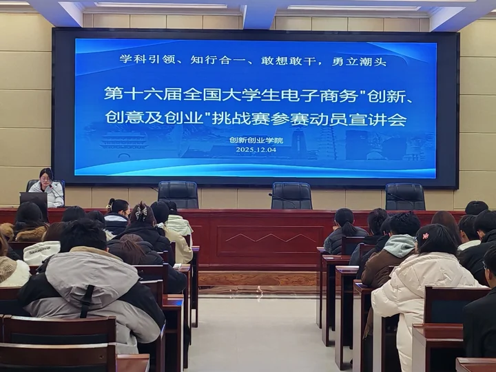 為積極備戰(zhàn)第十六屆全國(guó)大學(xué)生電子商務(wù)“創(chuàng)新、創(chuàng)意及創(chuàng)業(yè)”挑戰(zhàn)賽,激發(fā)學(xué)生參賽熱情,提升項(xiàng)目質(zhì)量,創(chuàng)新創(chuàng)業(yè)學(xué)院于12月4日在行樹(shù)樓北側(cè)報(bào)告廳舉行大賽動(dòng)員宣講會(huì)。來(lái)自全校9個(gè)學(xué)院的師生代表共計(jì)120人參加了本次動(dòng)員會(huì)。