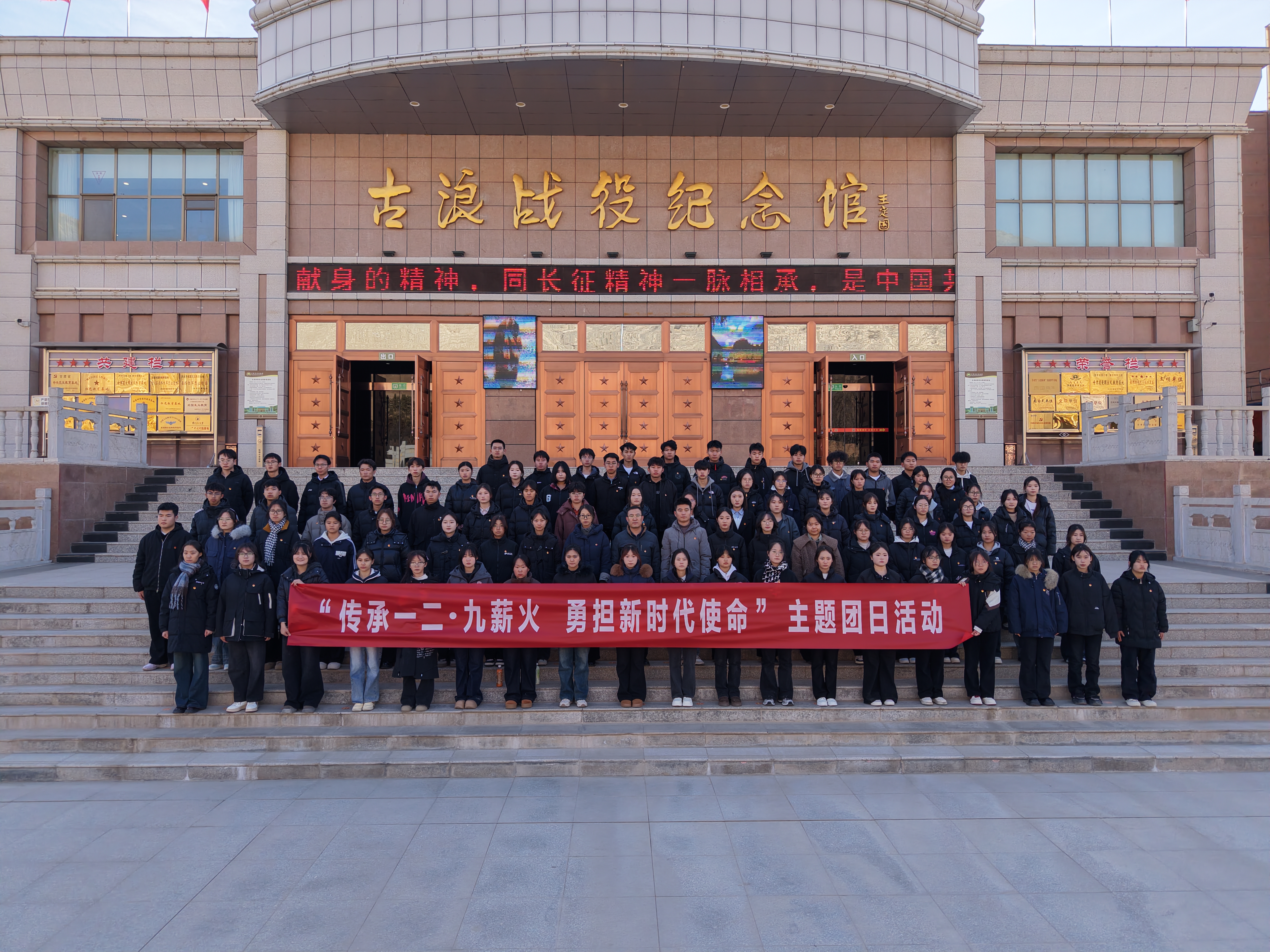 為深切緬懷革命先烈,弘揚(yáng)愛國(guó)主義精神,加強(qiáng)團(tuán)員青年思想政治引領(lǐng),12月6日,學(xué)校團(tuán)委在古浪戰(zhàn)役紀(jì)念館組織開展紀(jì)念“一二 · 九”運(yùn)動(dòng)主題團(tuán)日活動(dòng)暨新發(fā)展團(tuán)員集中入團(tuán)儀式。學(xué)校團(tuán)委全體干部,2025年下半年新發(fā)展團(tuán)員代表,團(tuán)學(xué)干部代表共計(jì)100人參加了活動(dòng)。