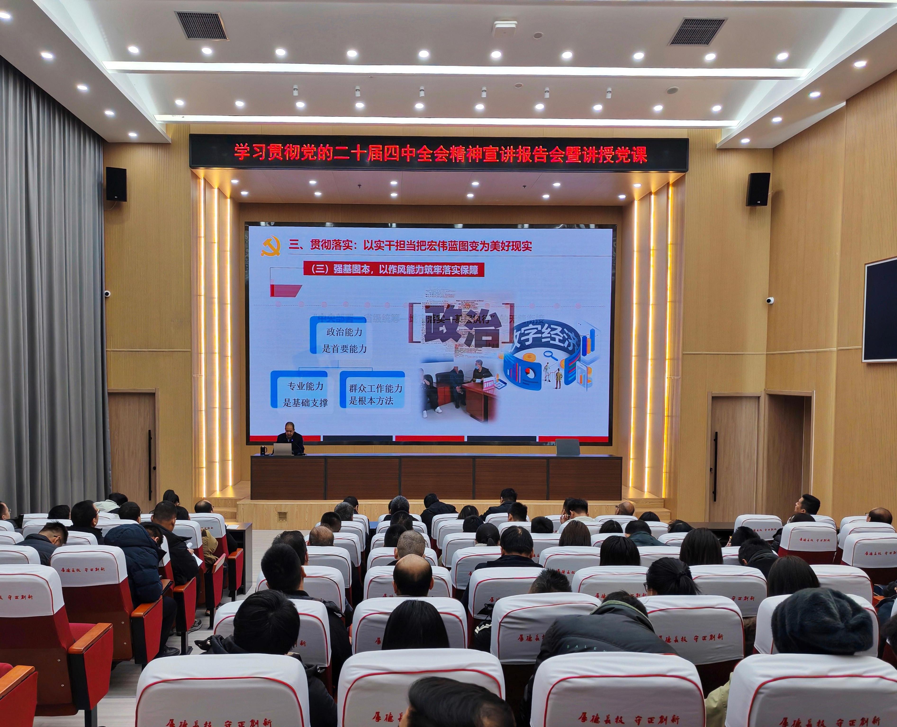 12月11日,學(xué)校宣講組成員、黨委副書記翟存祥在能源科技樓1樓報告廳作專題宣講報告,學(xué)院全體黨員及入黨積極分子聆聽學(xué)習(xí)。翟存祥從全會重大意義、核心要義、實(shí)踐要求三個維度,對黨的二十屆四中全會精神進(jìn)行了全面深入的解讀。他寄語師生,要將個人理想追求與國家發(fā)展大局緊密相連,主動對標(biāo)“十五五”規(guī)劃部署,傳承發(fā)揚(yáng)艱苦奮斗、銳意進(jìn)取的優(yōu)良作風(fēng),以實(shí)際行動助力學(xué)校教育教學(xué)高質(zhì)量發(fā)展,為推進(jìn)中國式現(xiàn)代化建設(shè)貢獻(xiàn)力量。