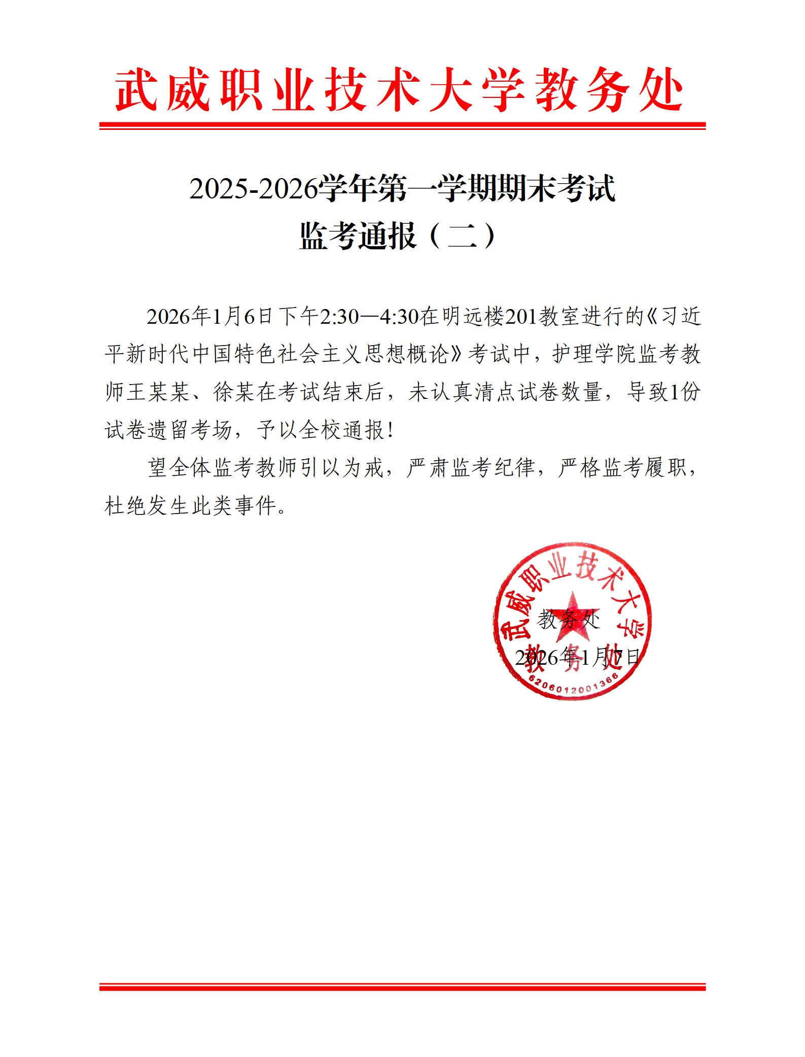 2025-2026學(xué)年第一學(xué)期期末考試監(jiān)考通報(二)