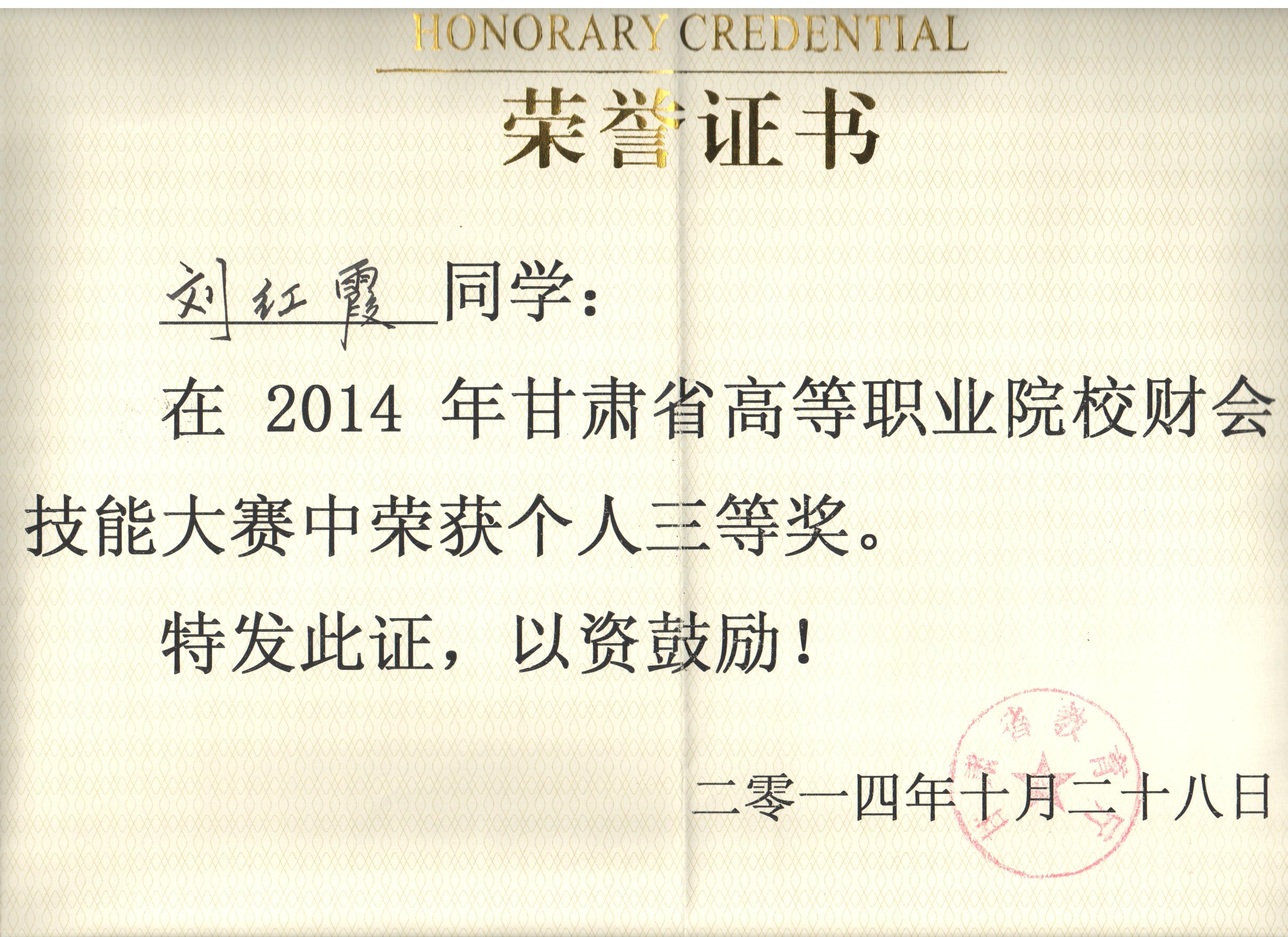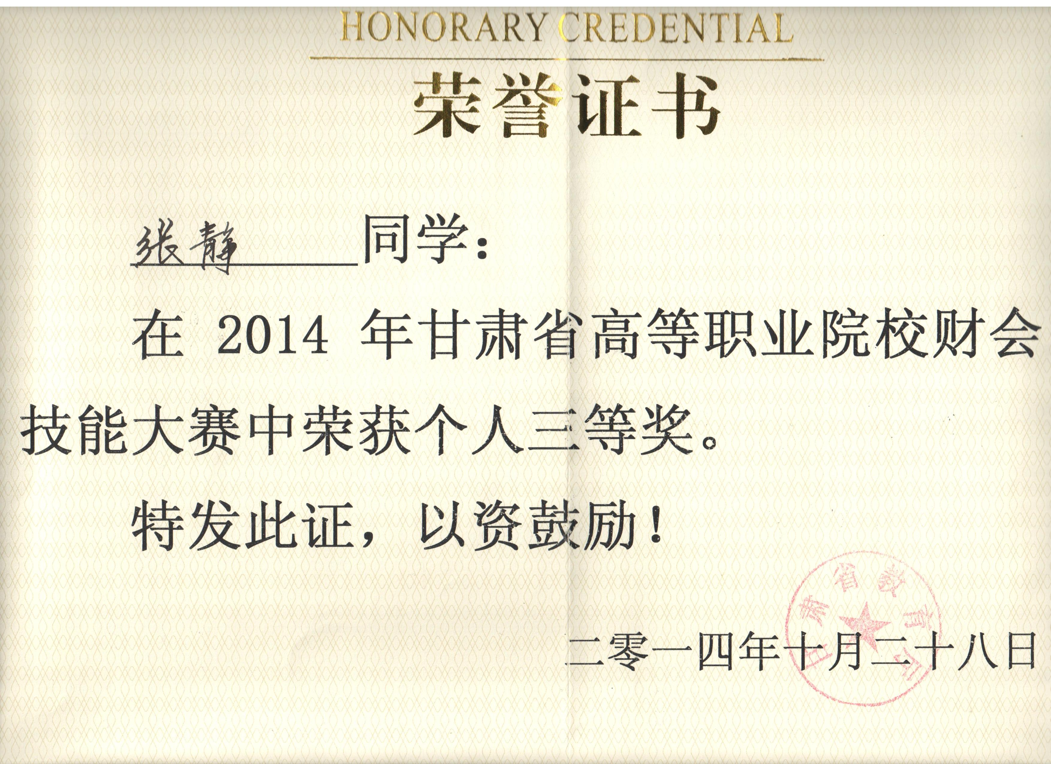 經(jīng)濟(jì)管理系李惠蘭、賀德赟老師指導(dǎo)我系會計專業(yè)學(xué)生參加2014年甘肅省高等職業(yè)學(xué)院財會技能大賽,榮獲優(yōu)秀獎。