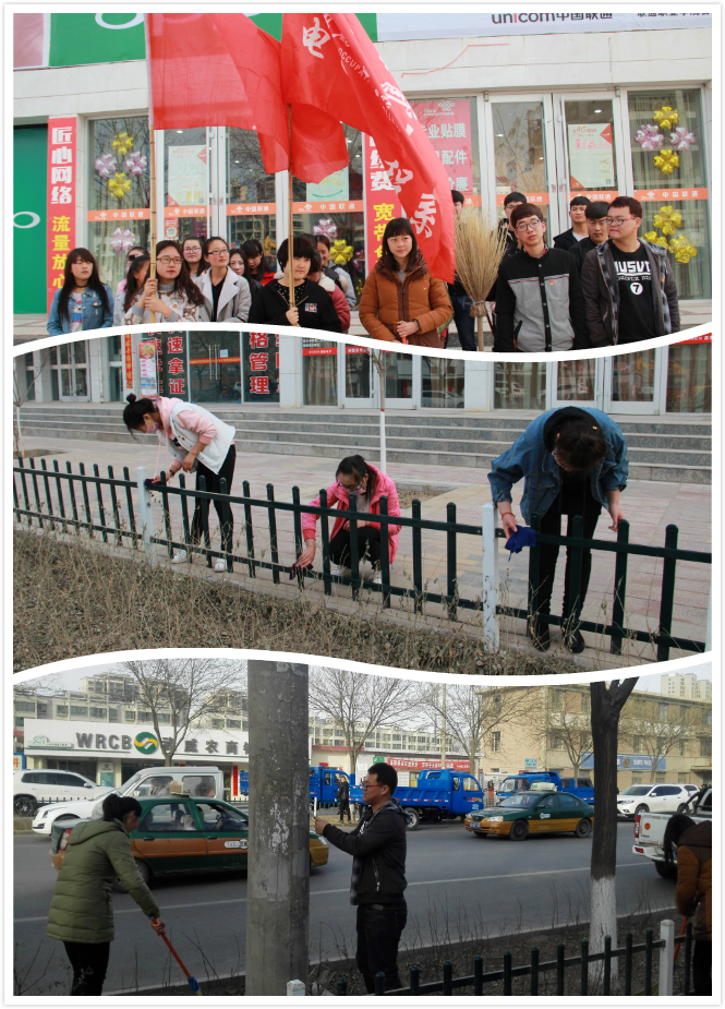電子信息工程系團總支結合團市委、院團委《關于開展城鄉(xiāng)環(huán)境衛(wèi)生整治青年志愿服務活動的通知》安排,3月3日下午16:30組織20名團員青年在學院北門口道路兩側開展了衛(wèi)生死角清掃,柵欄清潔,果皮箱清潔,公交站臺清潔,小廣告清理,垃圾清運。學生志愿者盡己所能,服務社會,傳播勞動信念,為建設美好社會貢獻自己的一份微薄力量。