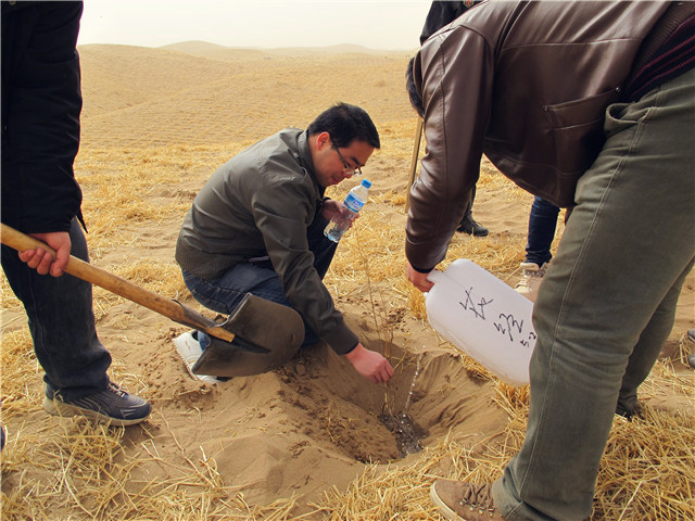 到達治沙造林現(xiàn)場后,師生按照劃分好的區(qū)域,帶上塑料桶,拿上土鉆,馬上投入到了緊張的勞動中。在現(xiàn)場技術(shù)人員的指導下挖坑、栽種樹苗、澆水,完成了預定的治沙造林任務。