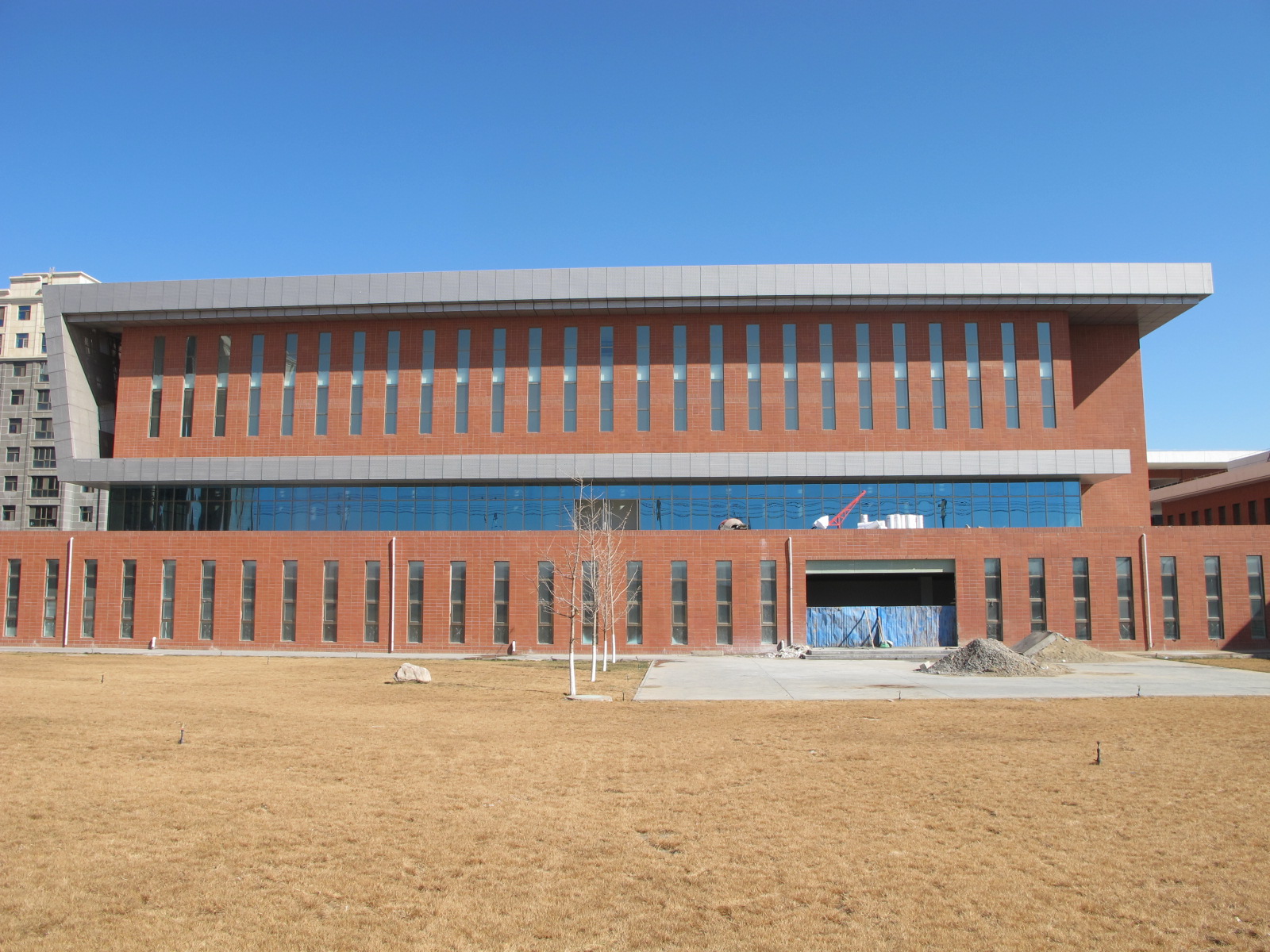體育館建設(shè)項目已完成外立面檐口的安裝,采用銀灰色2.5mm厚氟碳沖孔鋁單板,已完成玻璃幕墻的安裝,外立面盡顯端莊大氣。復(fù)工后,進(jìn)行一層上人屋面的防水層施工和防滑磚的鋪設(shè),完成一層頂女兒墻玻璃扶手的安裝。圖書館建設(shè)項目已完成外墻陶土劈開磚的粘貼、東西兩側(cè)外立面鋁板裝飾施工。復(fù)工后,繼續(xù)進(jìn)行內(nèi)部施工及裝修。
