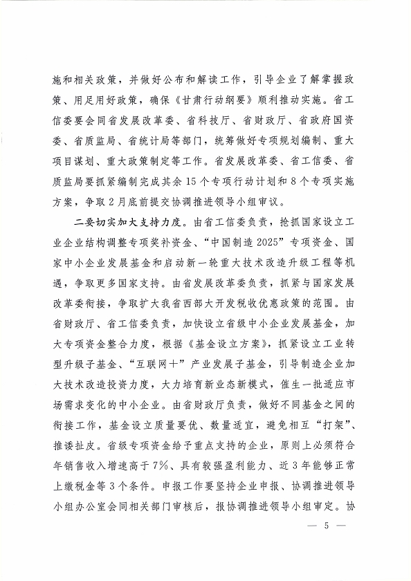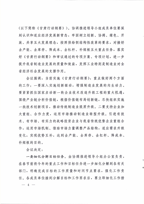 2016 年 1 月 30 日,省委副書記、省長(zhǎng)、中國(guó)制造 2025甘肅行動(dòng)綱要協(xié)調(diào)推進(jìn)領(lǐng)導(dǎo)小組組長(zhǎng)劉偉平主持召開了協(xié)調(diào)推進(jìn)領(lǐng)導(dǎo)小組第一次會(huì)議,研究部署我省行動(dòng)綱要的協(xié)調(diào)和推進(jìn)工作?,F(xiàn)將《中國(guó)制造 2025 甘肅行動(dòng)綱要協(xié)調(diào)推進(jìn)領(lǐng)導(dǎo)小組第一次會(huì)議紀(jì)要》轉(zhuǎn)發(fā)你們。