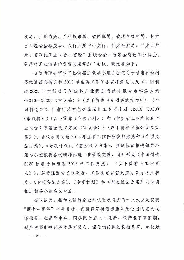 附件:中國(guó)制造 2025 甘肅行動(dòng)綱要協(xié)調(diào)推進(jìn)領(lǐng)導(dǎo)小組第一次會(huì)議紀(jì)要