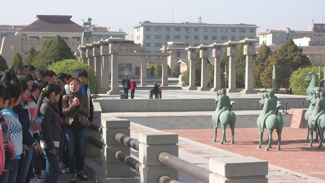 同學(xué)們在講解員的帶領(lǐng)下,首先從漢風(fēng)格大門"中華第一門"開始、參觀了天下第一馬"馬踏飛燕"、凝聚漢文化精粹的巨型浮雕、牌樓、圖騰柱以及堪稱"世界之最"的整體放大6倍的99件銅車馬儀仗俑隊列,最后參觀了雷臺漢文化陳列館.