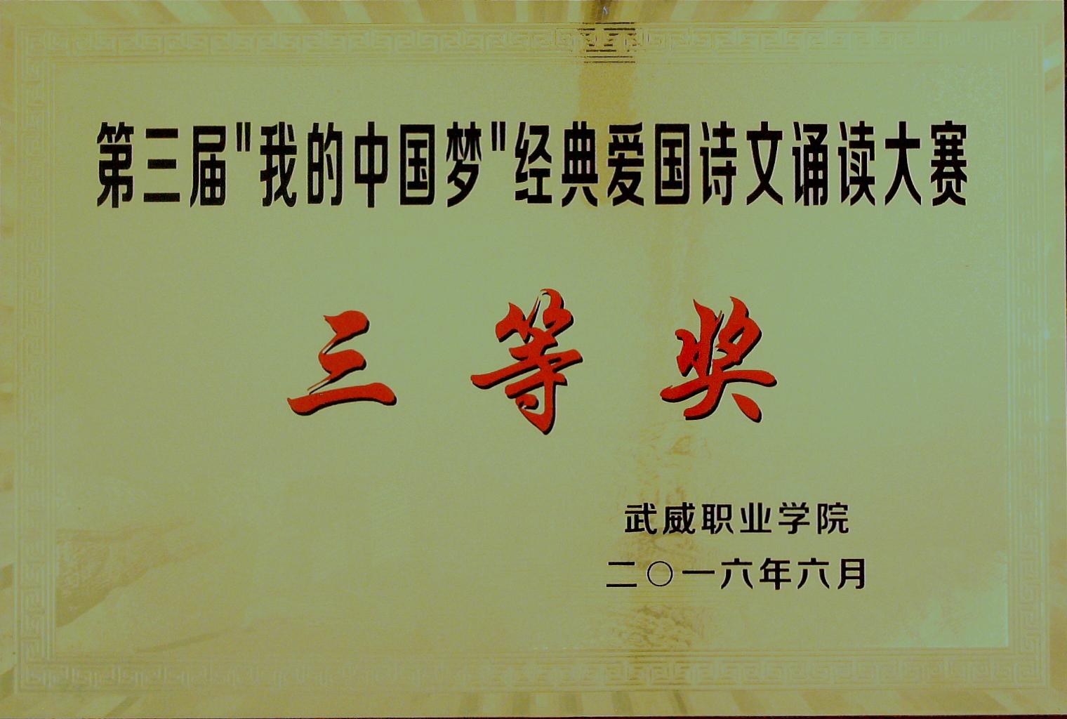 第三屆“我的中國(guó)夢(mèng)”經(jīng)典愛(ài)國(guó)詩(shī)文誦讀大賽三等獎(jiǎng)
