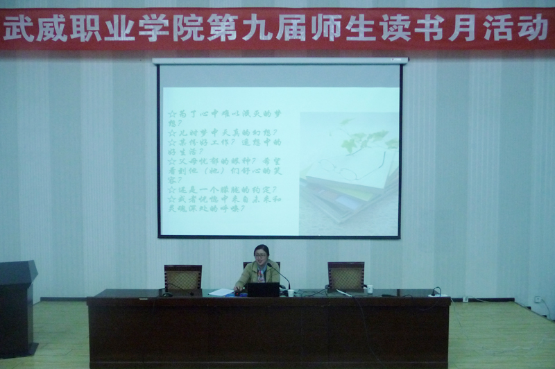 為在全院師生中營(yíng)造良好的讀書(shū)氛圍,豐富校園文化生活,在第22個(gè)世界讀書(shū)日來(lái)臨之際,4月20日,武威職業(yè)學(xué)院第九屆讀書(shū)月活動(dòng)專(zhuān)題講座在正德廳舉行。學(xué)院中文專(zhuān)業(yè)副教授、電子信息工程系主任李亞梅應(yīng)邀進(jìn)行了《為何而讀書(shū)》的專(zhuān)題講座,近300名師生參加了此次講座。