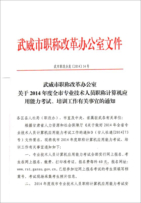 <轉(zhuǎn)>武威市職稱改革辦公室關(guān)于2014年度全市專業(yè)技術(shù)人員職稱計(jì)算機(jī)應(yīng)用能力考試、培訓(xùn)工作有關(guān)事宜的通知