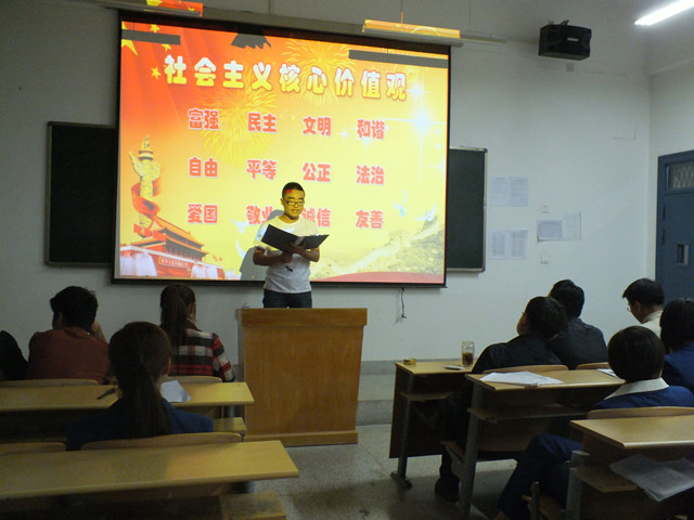 為深入學(xué)習(xí)貫徹黨的十八大精神和習(xí)近平總書(shū)記系列講話中關(guān)于大力推進(jìn)社會(huì)主義核心價(jià)值體系建設(shè)的要求,積極響應(yīng)院團(tuán)委的號(hào)召,我系于414日組織師生在4號(hào)教學(xué)樓313教室開(kāi)展了“社會(huì)主義核心價(jià)值觀引領(lǐng)我成長(zhǎng)”主題演講比賽。