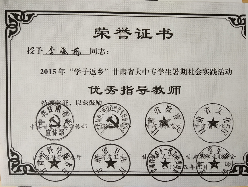 李強棟榮獲2015年“學子返鄉(xiāng)”甘肅省大中專學生暑期社會實踐活動優(yōu)秀指導教師