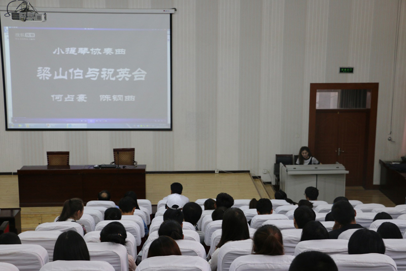 伴著優(yōu)美的音樂(lè)旋律王敏副教授開始了講座,王老師首先介紹了音樂(lè)發(fā)展歷史和音樂(lè)鑒賞的基礎(chǔ)知識(shí),然后以我國(guó)著名作曲家陳鋼、何占豪先生創(chuàng)作的小提琴協(xié)奏曲《梁山伯與祝英臺(tái)》為題材,分階段講述了“鳥語(yǔ)花香”、“草橋結(jié)拜”、“英臺(tái)抗婚”、“投墳化蝶”等內(nèi)容和藝術(shù)場(chǎng)景。剖析了作品在管樂(lè)、和以小提琴、大提琴為主的弦樂(lè)及民樂(lè)有機(jī)結(jié)合的高超藝術(shù)境界,講座過(guò)程中王老師結(jié)合《梁?!穮f(xié)奏曲音視頻資料,演繹了梁山伯與祝英臺(tái)凄美的愛(ài)情故事。