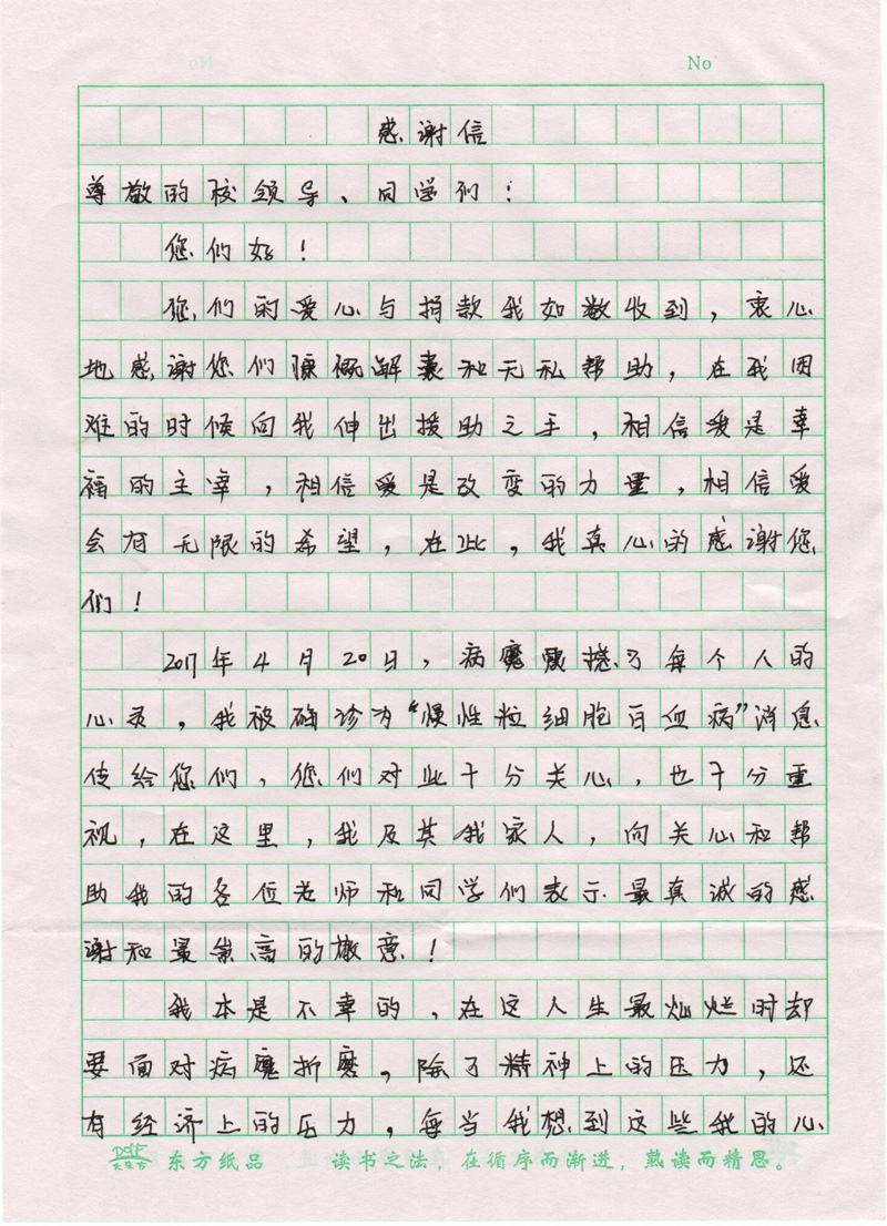 高國(guó)棟是我院機(jī)械制造系2015級(jí)機(jī)械設(shè)計(jì)與制造大專(zhuān)班學(xué)生,于2017年4月確診為慢性粒細(xì)胞白血病。得知這一特殊情況后,學(xué)院宣傳統(tǒng)戰(zhàn)部、團(tuán)委、學(xué)生工作處第一時(shí)間向全院廣大師生發(fā)出倡議,號(hào)召大家獻(xiàn)出愛(ài)心,幫助高國(guó)棟同學(xué)度過(guò)難關(guān)。學(xué)院廣大師生紛紛解囊,慷慨相助。目前捐助的善款已經(jīng)交給高國(guó)棟同學(xué)。為此,高國(guó)棟同學(xué)特意寫(xiě)來(lái)感謝信,表達(dá)對(duì)母校廣大師生的感激之情。在此,我們衷心祝愿高國(guó)棟同學(xué)能在困境中迎難而上,樹(shù)立戰(zhàn)勝疾病的信心,爭(zhēng)取早日康復(fù),重返校園。
