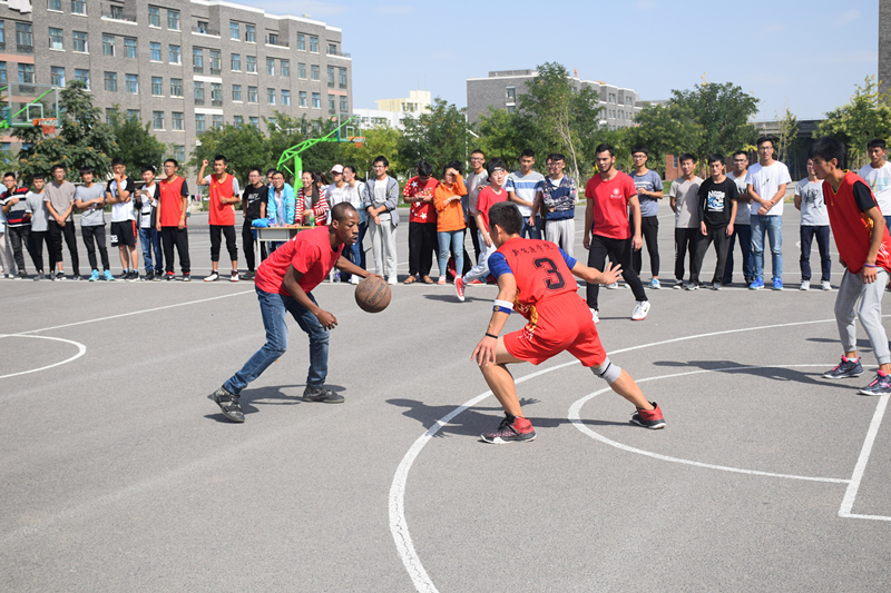在籃球場(chǎng)上,留學(xué)生和學(xué)院學(xué)生展開了籃球友誼交流賽,他們本著“友誼第一,比賽第二”的精神開展籃球交流,經(jīng)過激烈的角逐,留學(xué)生代表隊(duì)以一分的優(yōu)勢(shì)獲勝。賽后,中外球員互相擁抱并合影留念。