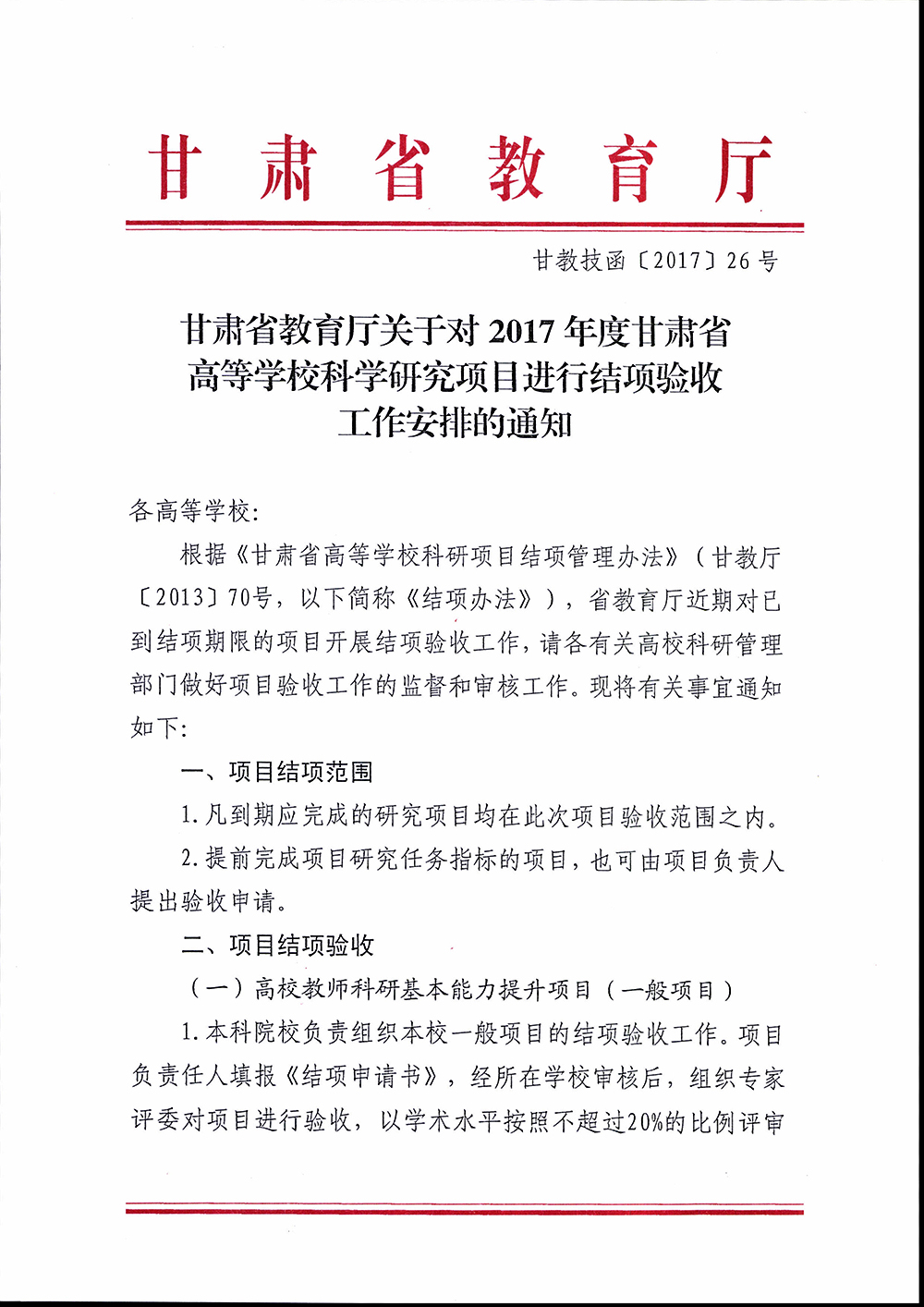 轉(zhuǎn)發(fā)甘肅省教育廳關(guān)于對2017年度甘肅省高等學(xué)??茖W(xué)研究項(xiàng)目進(jìn)行結(jié)項(xiàng)驗(yàn)收工作安排的通知