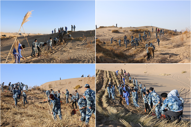 在勞動(dòng)現(xiàn)場(chǎng),學(xué)院領(lǐng)導(dǎo)和師生們不畏冬寒,分工協(xié)作,按照標(biāo)準(zhǔn)和要求劃線開(kāi)溝、蒲草培沙、等距離推進(jìn),現(xiàn)場(chǎng)一片熱火朝天的景象。荒蕪的沙地身披新衣,整齊的稻草方格逐漸向遠(yuǎn)處的沙丘覆蓋。