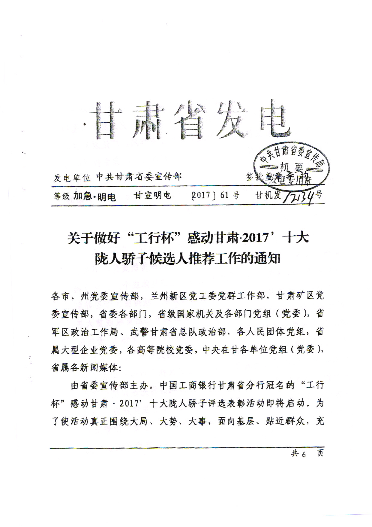 關(guān)于推薦“工行杯”感動甘肅?2017十大隴人驕子候選人的工作通知