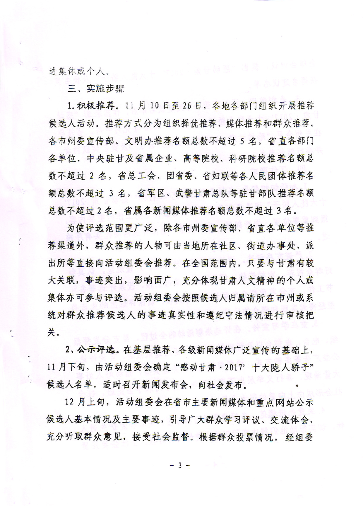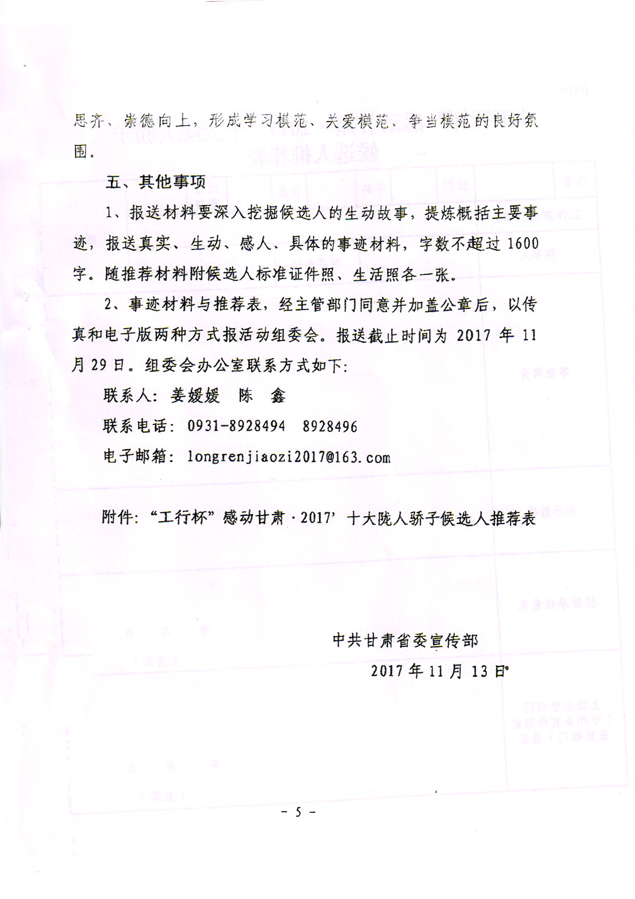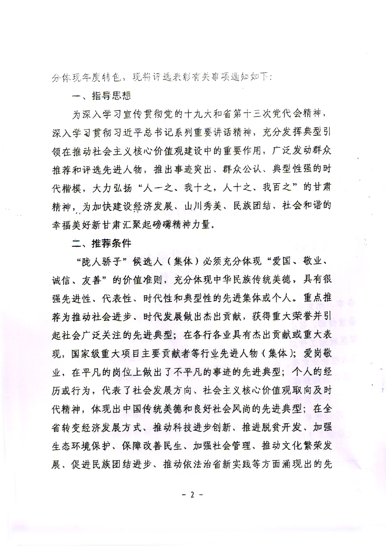 2.推薦對象必須按照《中共甘肅省委宣傳部〈關(guān)于做好‘工行杯’感動甘肅·2017十大隴人驕子候選人推薦工作的通知》中的推薦條件確定。