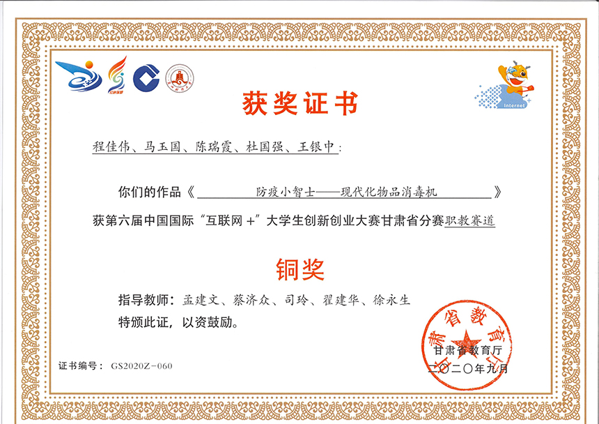 第六屆中國國際“互聯(lián)網(wǎng)+”大學生創(chuàng)新創(chuàng)業(yè)大賽甘肅省分賽職教賽道《防疫小智士—現(xiàn)代化物品消毒機》”